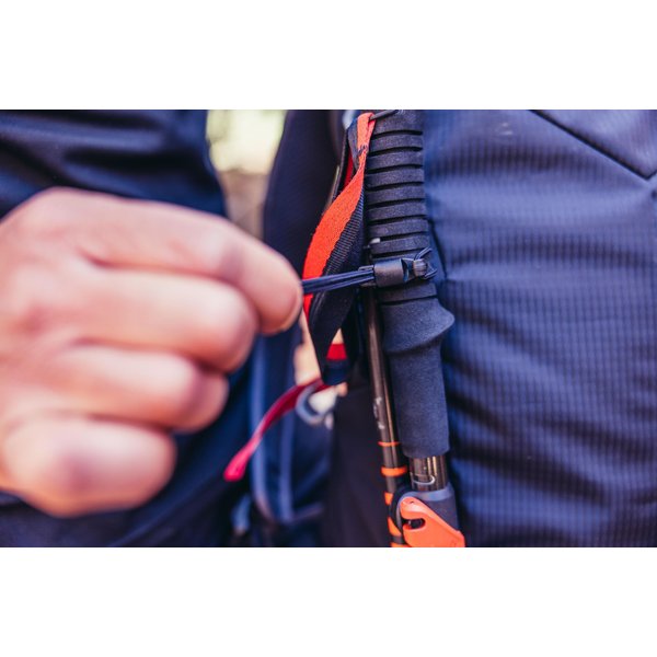- system mocowania kijów trekkingowych z regulowanymi pętlami typu bungee oraz pętlami na dole