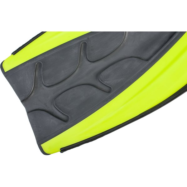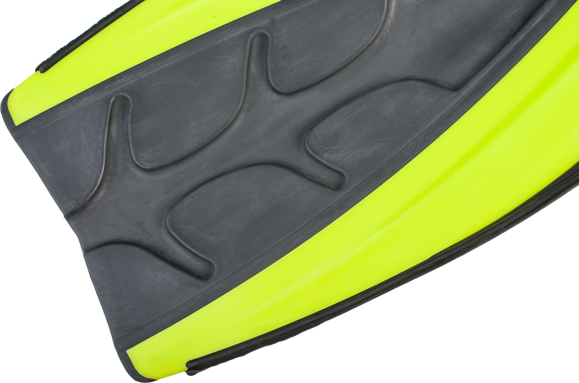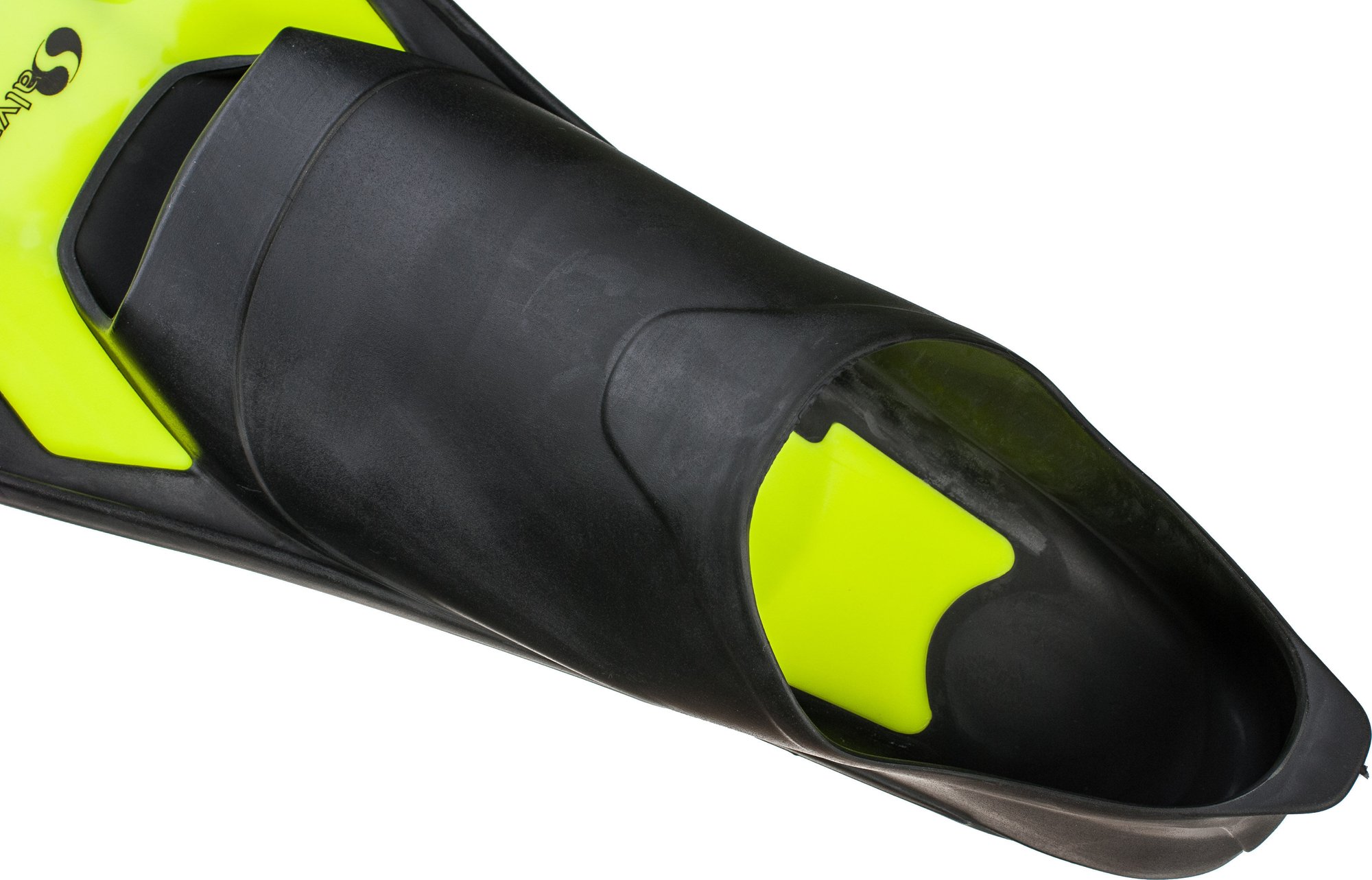 - gumowa wstawka w części przedniej tworzy tunel kierując strumień wody do tyłu, zwiększając tym samym siłę ciągu, szybkość płetwy i jednocześnie zmniejsza zmęczenie nóg