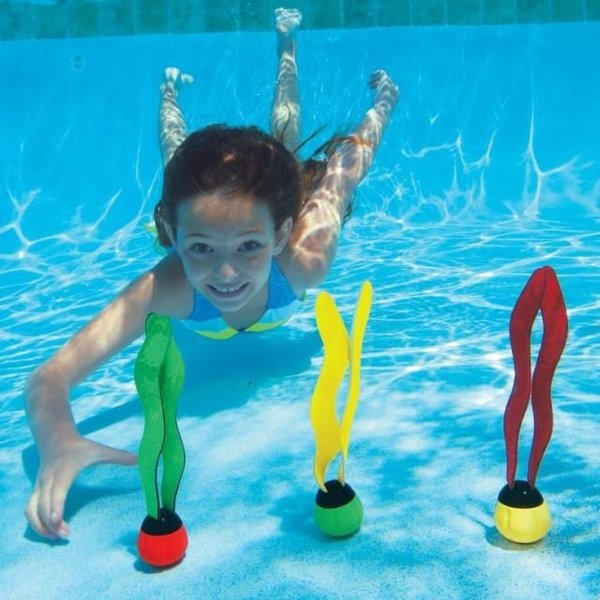 Wystarczy, że wrzucisz je do basenu, a one przyjmą pozycję pionową na dnie zbiornika. Zadaniem dziecka jest zanurkować i wyciągnąć każdy z wodorostów. Podwodne kule dostępne są w 3 intensywnych barwach, więc spostrzeżenie ich pod wodą nie będzie stanowiło problemu.