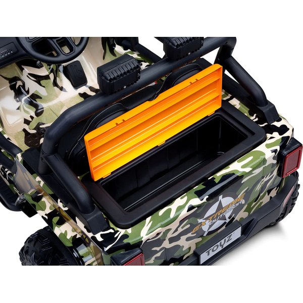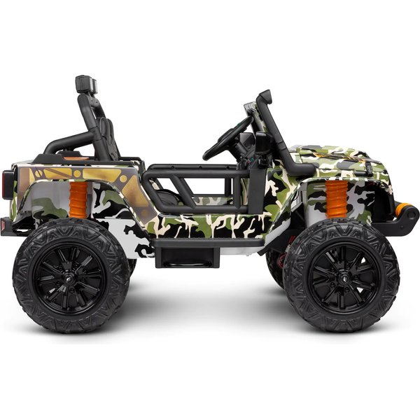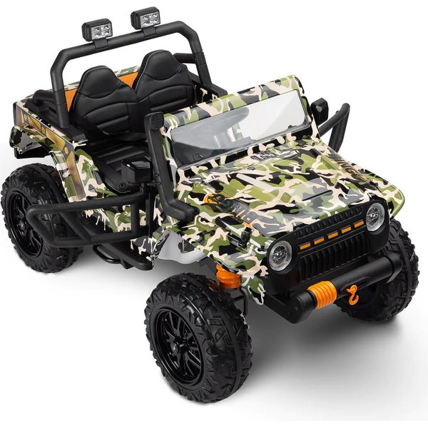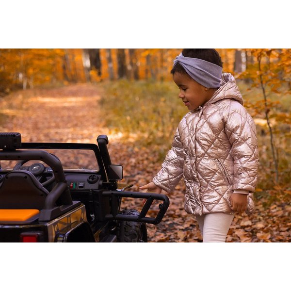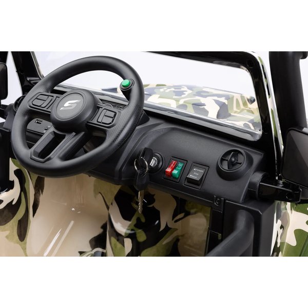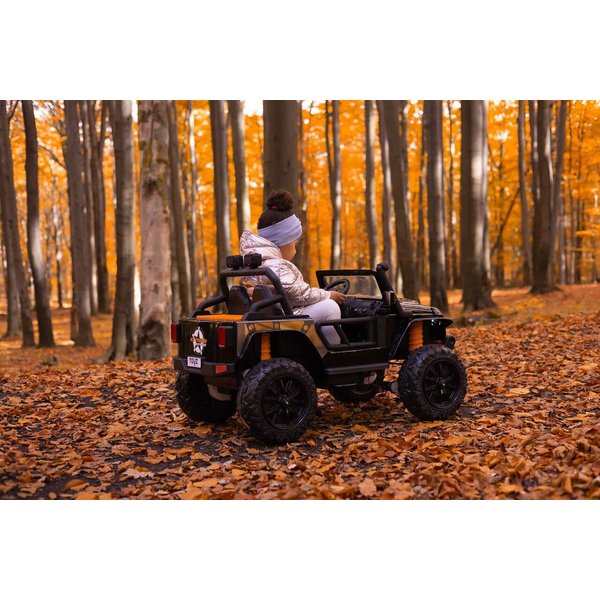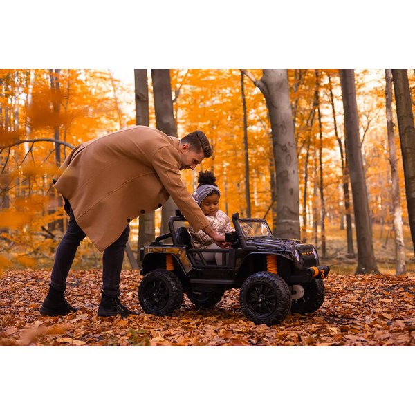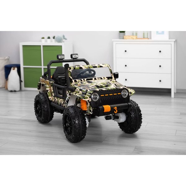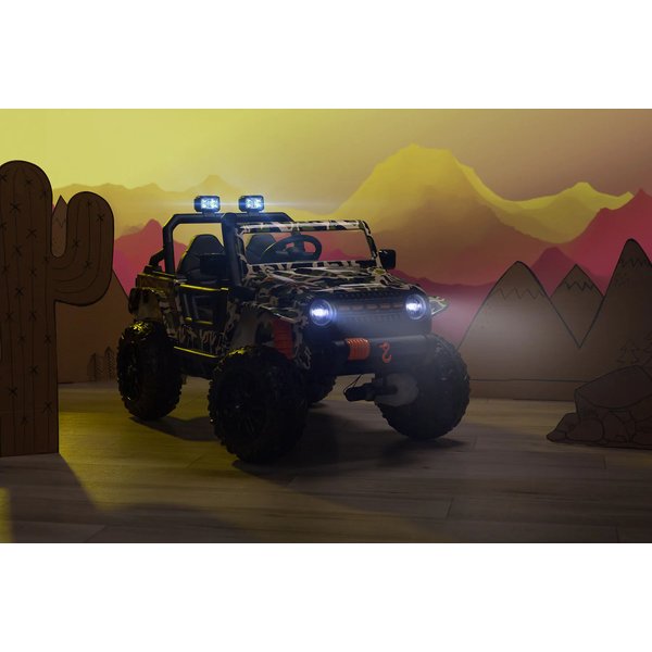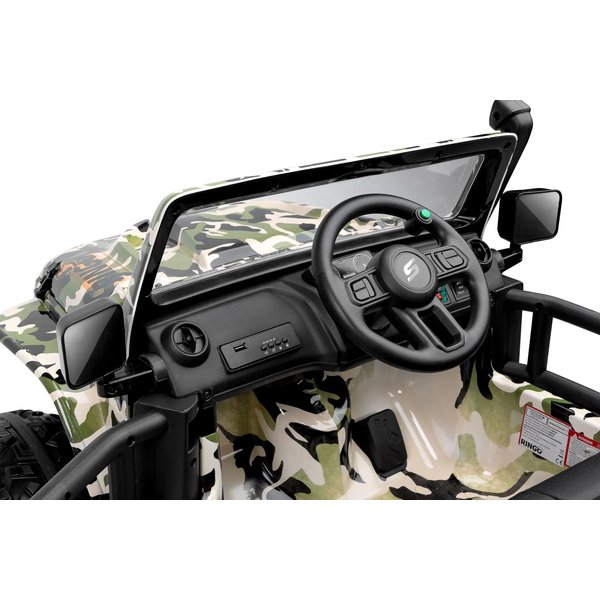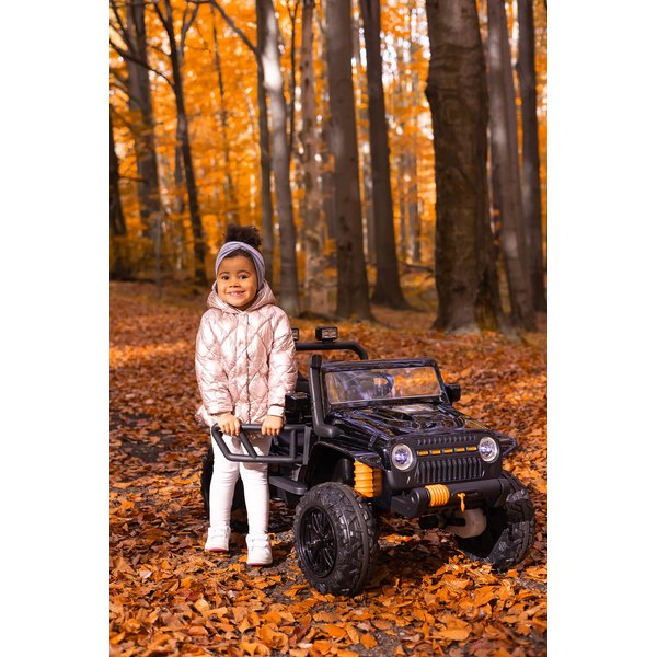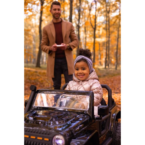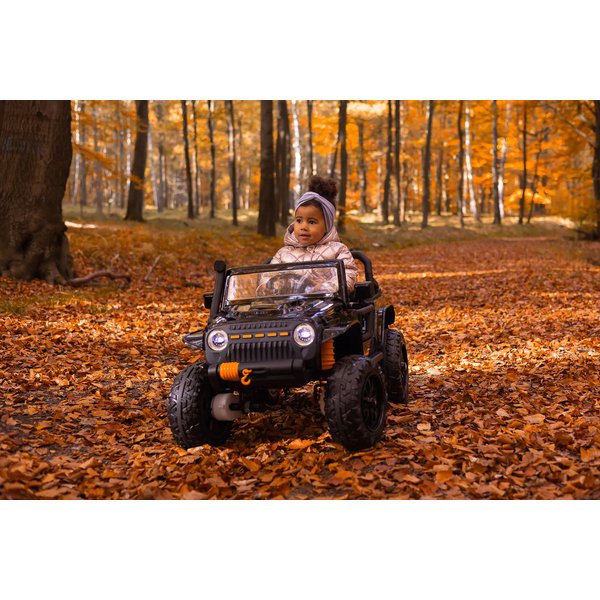 Ten terenowy pojazd akumulatorowy, inspirowany kultowym Jeepem Wranglerem, posiada wiele imponujących cech. Dzięki czterem mocnym silnikom, każde koło jest zasilane osobno, co pozwala na łatwe poruszanie się po terenie. 18-sto centymetrowy prześwit i 30-sto centymetrowe opony z dużym bieżnikiem wykonane z pianki EVA, zapewniają doskonałą trakcję na różnorodnych nawierzchniach. Komfort jazdy jest gwarantowany dzięki amortyzatorom na tylnej osi, wygodnemu siedzeniu i panelowi muzycznemu z bluetooth i USB. Lakierowana karoseria i przednie światła LED nadają temu pojazdowi stylowy wygląd, a wysuwane stopnie ułatwiają wsiadanie dla mniejszych dzieci. Rodzic może również kontrolować jazdę za pomocą pilota, co sprawia, że Ringo Toyz Caretero jest idealny dla rodziców i dzieci, którzy chcą cieszyć się wspólną zabawą.