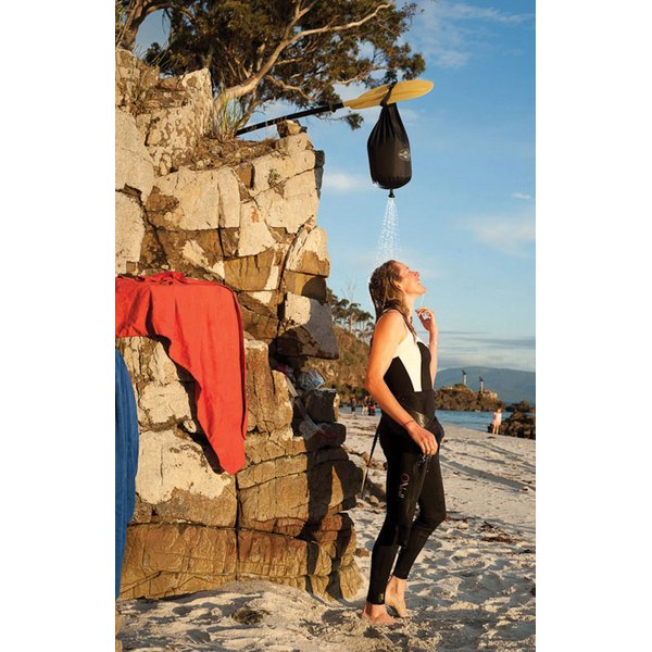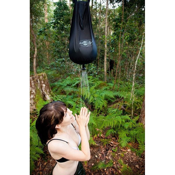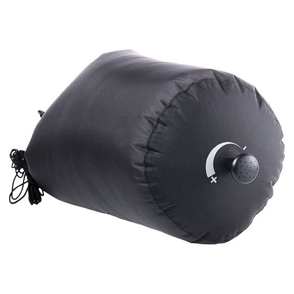Prysznic wykonany został z wodoodpornego nylonu 70D z rolowanym zamknięciem, często spotykanym w workach suchych. Na spodzie prysznica zamontowana została wylewka prysznicowa z obrotowym zaworem służącym do odkręcania i zakręcania wody oraz regulacji jego strumienia. Pojemność Pocket Shower to 10L, co starczy na 7-8 minutowy prysznic. Aby swobodnie z niego korzystać wystarczy, że zawiesisz go przykładowo na gałęzi, używając 2 pętli wykonanych z wytrzymałego materiału Delrin™ oraz linki o długości 6m. Prysznic jest w kolorze czarnym, co również nie pozostaje bez znaczenia, bowiem kolor ten świetnie absorbuje promienie słoneczne, a co za tym idzie, woda szybciej się nagrzewa. Aby ułatwić Ci kwestie transportu i przechowywania, w zestawie z prysznicem otrzymasz także kompaktowe etui zamykane na zamek.