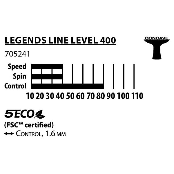 Ten podstawowy model rakietki z linii Legends jest inspirowany takimi gwiazdami tenisa stołowego jak Jan-Ove Waldner, Jörgen Perssonowi i Steffen „Speedy” Fetzner. Model 400 FSC przeznaczony jest dla początkujących lub okazjonalnych graczy rekreacyjnych i posiada dość gładką powłokę pimple inside, zatwierdzoną przez ITTF. Dzięki gąbce o grubości 1,6 mm rakietka zapewnia Ci niezbędną moc i dobrą kontrolę, pozwalając w spokoju zgłębiać tajniki gry w tenisa! Certyfikowane drewno, użyte do produkcji rakietki sprawia, że Twój wybór będzie odpowiedzialny i dobry dla środowiska naturalnego.