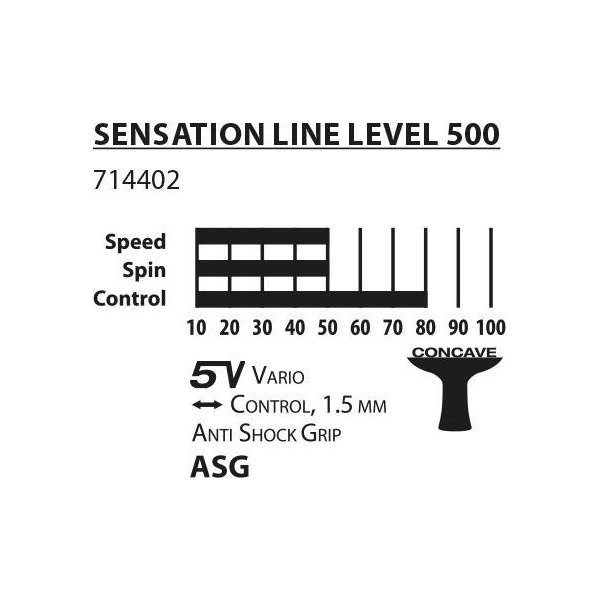 Ta rakieta to nie tylko gwarancja najwyższej jakości materiałów, z których jest zrobiona, lecz także idealne rozwiązanie dla wszystkich zaawansowanych graczy tenisa stołowego, którzy pragną doskonalić swoją technikę. A umożliwi im to przede wszystkim uniwersalna grubość gąbki 1,8 mm, która świetnie nadaje się zarówno do defensywnego, jak i ofensywnego stylu gry. Dodatkowo rakietka Sensation 500 posiada uchwyt absorbujący uderzenia i wstrząsy, tzw. Anti Shock Grip. Materiały syntetyczne, które absorbują wstrząsy, oraz gąbka, która całkowicie amortyzuje rączkę, powodują zmniejszenie drgań i zapewniają lepszą kontrolę podczas gry. Dzięki technologii ASG uchwyt w Sensation 500 bardzo dobrze leży w dłoni i nie powoduje ucisku, a ponadto chłonie pot, zapewniając pewny chwyt rakietki.