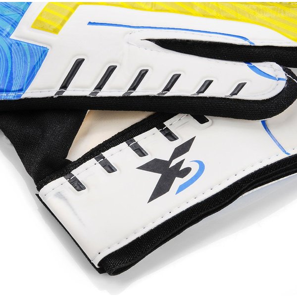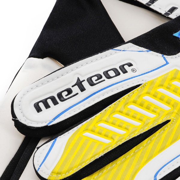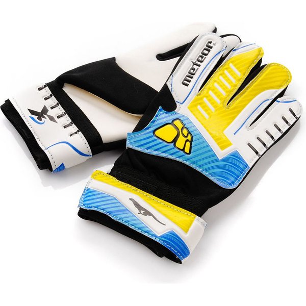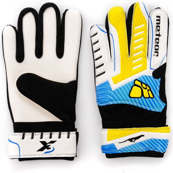 Dziecięce rękawice bramkarskie X-3 marki Meteor przeznaczone na treningi lub spotkania meczowe. Cechuje jedobre tłumienie uderzeń oraz wysoka odporność na ścieranie, dzięki czemu będą służyć przez długi czas.