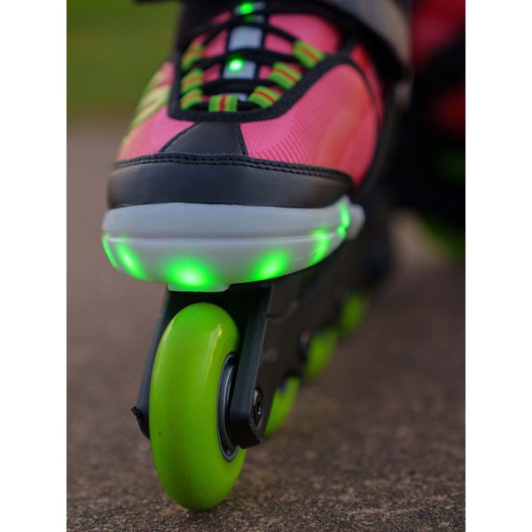 Ważnym elementem konstrukcji rolek jest bardzo stabilna i mocna płoza F. B. I. Sprawia ona, że nawet na wertepach rolki nie zawiodą. Wbudowane kółka wykonane z kauczuku o twardości 80A osadzone są w łożyskach ABEC 3, dzięki rolki gwarantują stabilną i płynną jazdę, niezależnie od tego, czy dziecko lubi spokojniejszą jazdę, czy szalone triki. Świecące diody LED w palcach i na języku szybko przyciągną uwagę dziecka, dostarczając mu mnóstwa przyjemności z jazdy i jednocześnie zapewniając lepszą widoczność podczas wieczornych przejażdżek po zmroku. Można je aktywować za pomocą specjalnego przycisku na jeżyku. Do wyboru dla Twojej pociechy przewidziano dwa tryby: stałe świecenie lub mocne miganie.