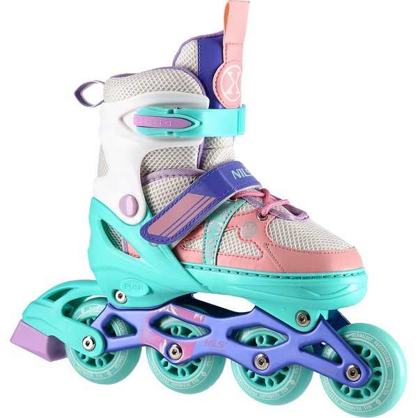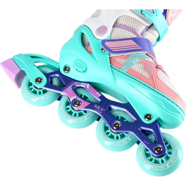 Rolki regulowane NJ1828A Nils to idealne rozwiązanie dla miłośników jazdy na łyżworolkach. Dzięki półmiękkim butom i trójstopniowemu systemowi zapięcia - klamrowemu, na rzep oraz sznurowaniu, zapewniają one maksymalne bezpieczeństwo i komfort użytkowania. Regulacja rozmiaru buta jest prosta i intuicyjna, co pozwala dopasować go do stopy. Aluminiowa płoza oraz kółka z łożyskami ABEC7 gwarantują płynne i szybkie poruszanie się. Dodatkowo, łyżworolki posiadają hamulec, co sprawia, że są nie tylko wygodne, ale także bezpieczne i stabilne podczas jazdy.