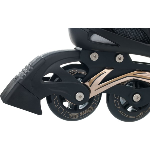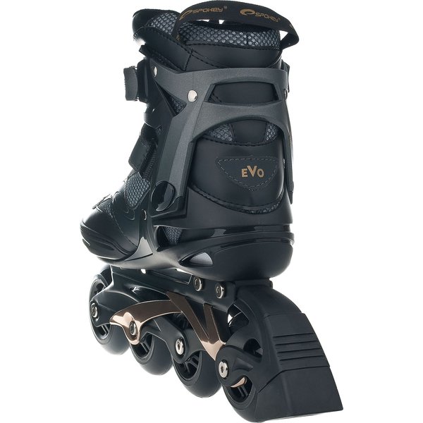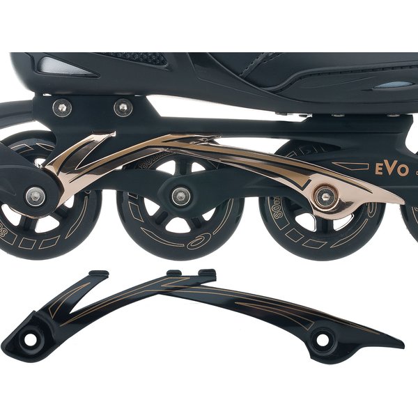 Płozy są aluminiowe, dzięki czemu doskonale przekazują energię odepchnięcia, są szybkie i zapewniają maksymalną stabilność, więc nawet osoby początkujące będą czuć się pewnie z rolkami Evo na nogach. Płozy wspomagają wysokiej klasy łożyska ABEC7, które pozwalają osiągać naprawdę duże prędkości. Kółka o twardości 82A zapewniają doskonałą przyczepność i perfekcyjne tłumienie drgań, dzięki czemu komfort użytkowania jest najwyższy.