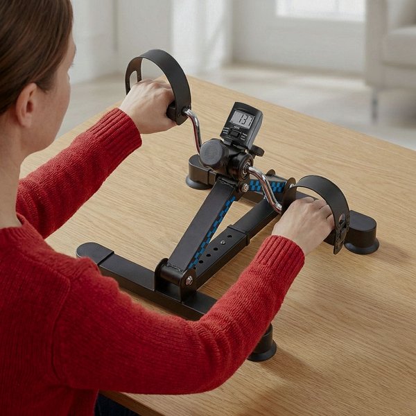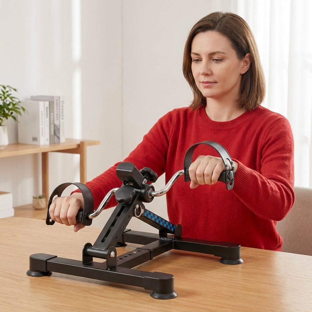 - Trening dwufunkcyjny – ręce i nogi: Dzięki obrotowym pedałom i stabilnej konstrukcji możliwe jest wykonywanie ćwiczeń zarówno kończyn dolnych, jak i górnych. Sprzęt można łatwo ustawić na podłodze lub stole, dostosowując go do rodzaju treningu.