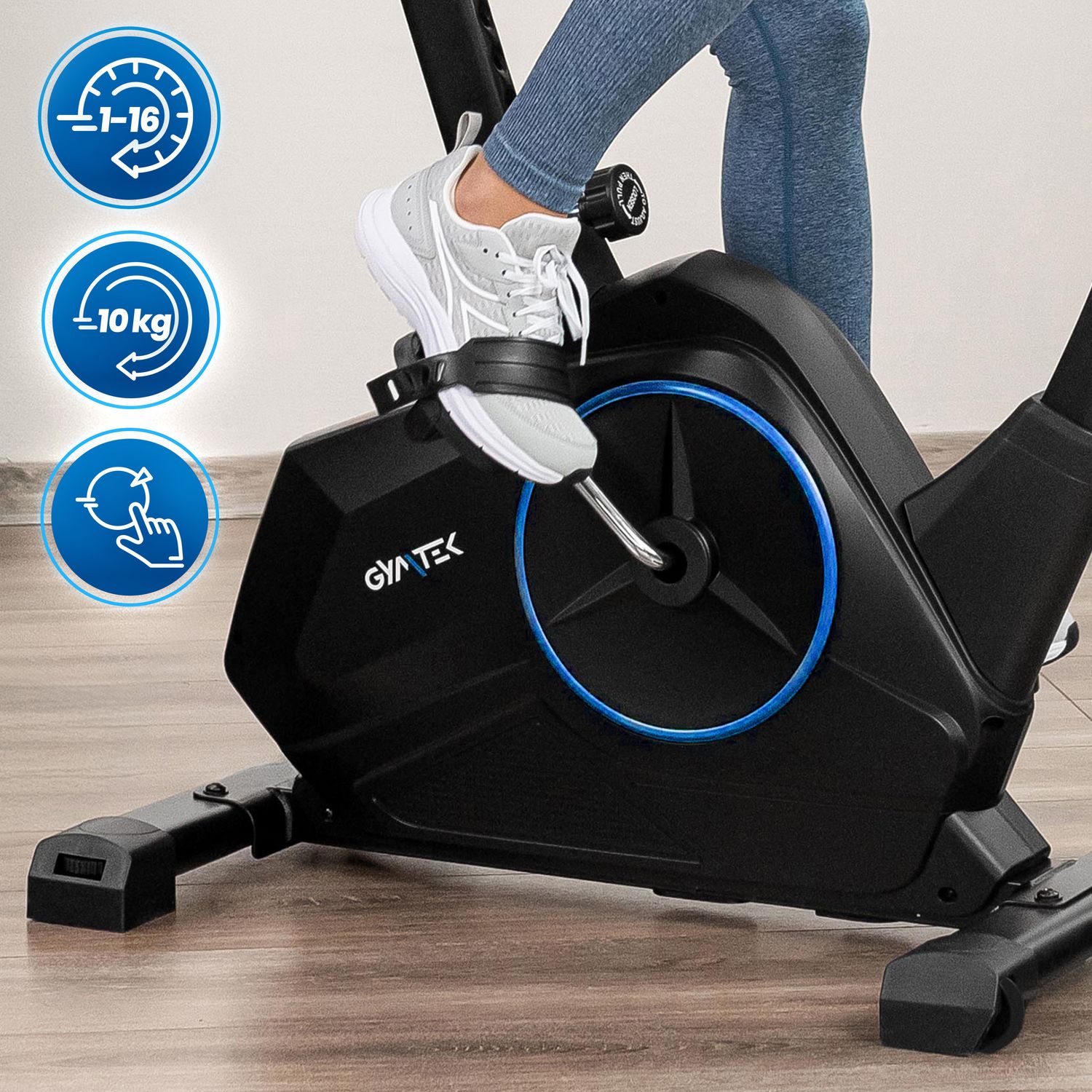 System oporu w rowerze Gymtek zapewnia precyzyjną i harmonijną regulację obciążenia. Dzięki 16-stopniowej, elektronicznej regulacji użytkownik może dostosować intensywność treningu do swoich potrzeb, a 10-kilogramowy system oporu gwarantuje stabilność i równomierne rozłożenie siły na pedały.