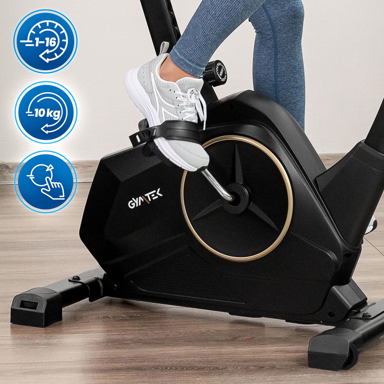 System oporu w rowerze Gymtek zapewnia precyzyjną i harmonijną regulację obciążenia. Dzięki 16-stopniowej, elektronicznej regulacji użytkownik może dostosować intensywność treningu do swoich potrzeb, a 10-kilogramowy system oporu gwarantuje stabilność i równomierne rozłożenie siły na pedały.