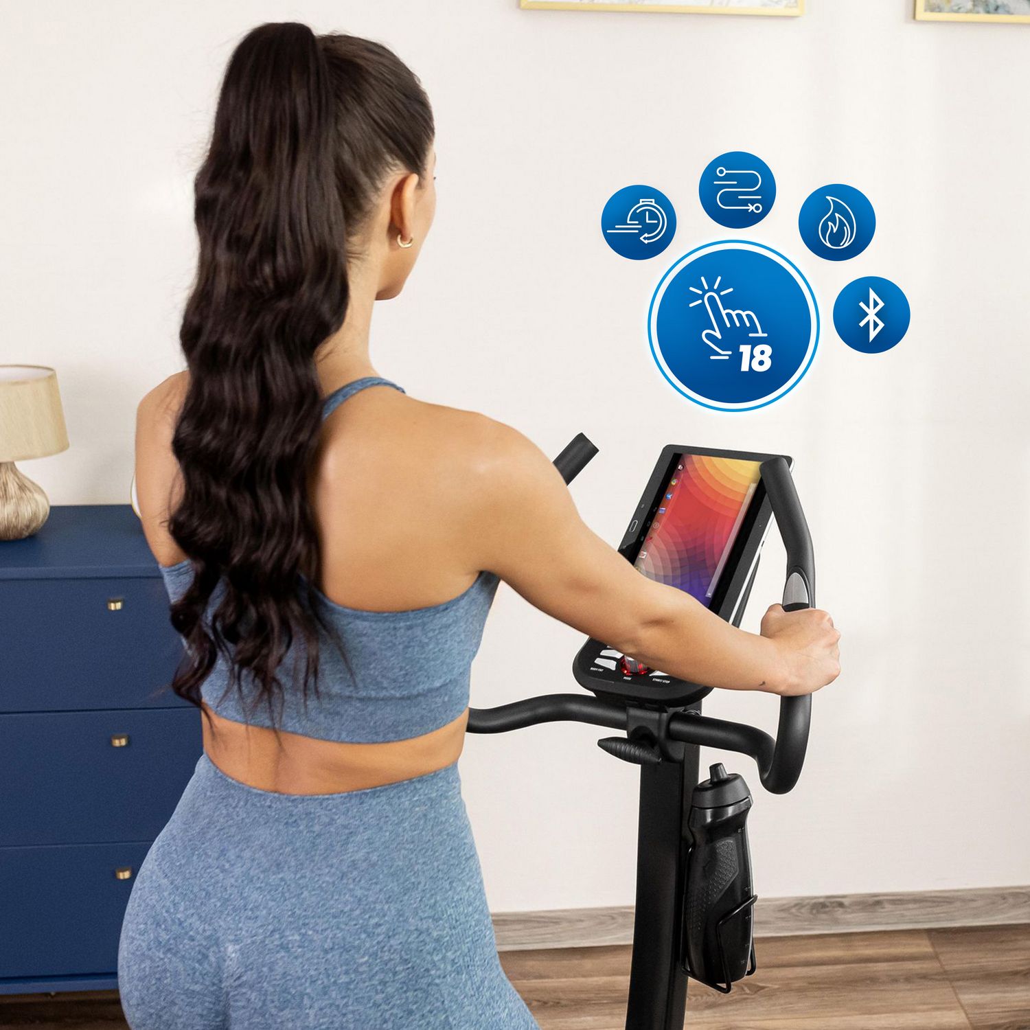 Komputer oferuje 18 programów treningowych oraz łączność Bluetooth, co umożliwia kompatybilność z aplikacją iConsole+. Duży wyświetlacz LCD zapewnia dostęp do kluczowych parametrów treningowych, a wbudowane czujniki mierzą puls.