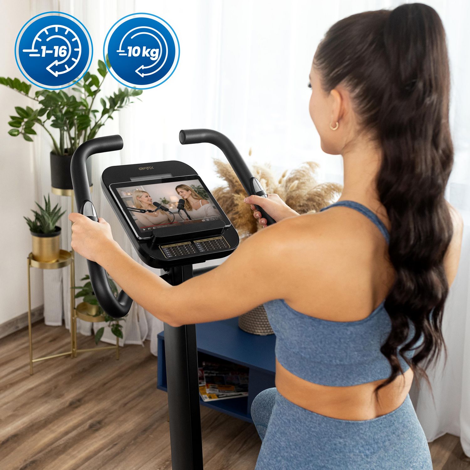 - Uchwyt na urządzenie mobilne: Umożliwia korzystanie z telefonu lub tabletu podczas treningu, co pozwala na oglądanie ulubionych treści i zwiększa motywację.