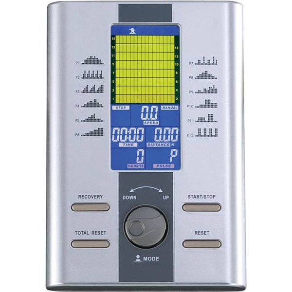 - regulacja oporu za pomocą nowoczesnego wielofunkcyjnego komputera z dużym kolorowym wyświetlaczem LCD i programatorem umożliwiającym ustawienie programów ze stałym i zmiennym obciążeniem oraz indywidualnych treningów użytkownika