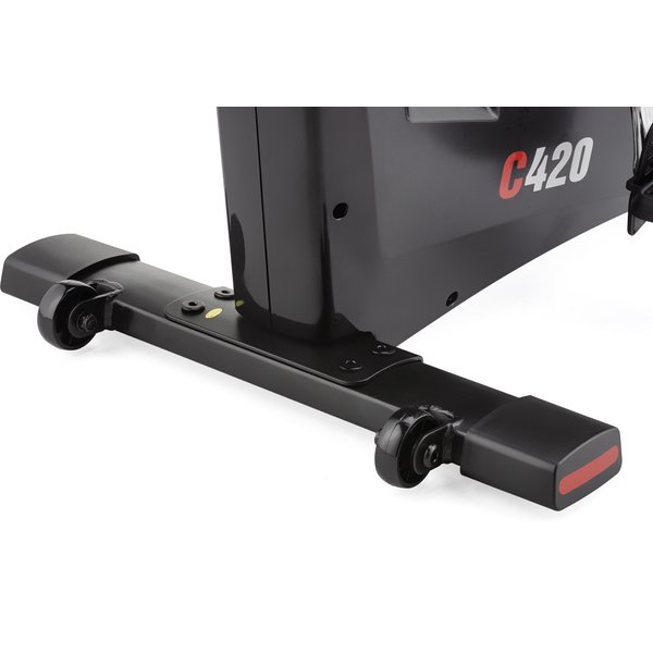 Zastosowany system oporu sprawia, że trening na rowerze odbywa się w sposób płynny i cichy. 32 poziomy obciążenia regulowane są w sposób elektroniczny. Regulować możesz kierownicę poprzez pochylenie lub siedzisko w pionie i w poziomie. Sensory dotykowe umieszczone na uchwytach umożliwiają wygodny i precyzyjny pomiar pulsu, a co za tym idzie, możliwość wykonywania treningów cardio. Stopki poziomujące zapewniają stabilność sprzętu na każdym rodzaju podłoża. Rolki transportowe natomiast pozwalają na ułatwione przenoszenie sprzętu między pomieszczeniami. Praktyczny uchwyt na bidon przypomni Ci o konieczności przygotowania wody lub napoju izotonicznego przed treningiem. C420 posiada 22 programy treningowe, w tym programy zorientowane na cel, sterowane tętnem oraz predefiniowane. Czytelny ekran wyświetla informacje o Twoim treningu takie jak pokonany dystans, spalone kalorie czy prędkość pedałowania.