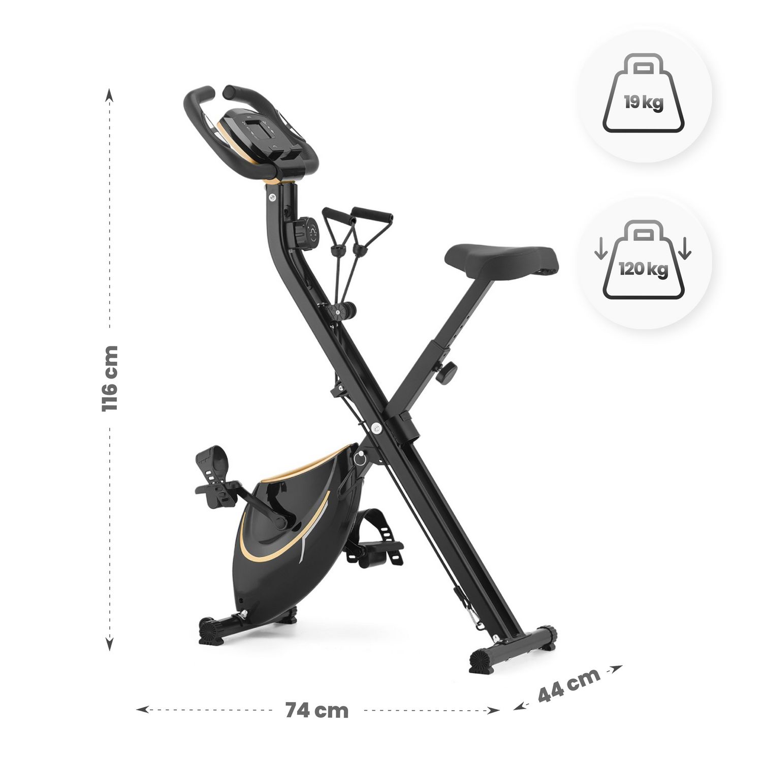 Składana konstrukcja pozwala na szybkie i łatwe złożenie sprzętu, co pomaga zaoszczędzić miejsce w domu. Ergonomiczne rozwiązania, takie jak regulowane siodełko i pedały z antypoślizgową powierzchnią, zapewniają wygodę i stabilność podczas treningu. Dzięki wbudowanym rolkom na przednim stabilizatorze sprzęt można bez trudu przemieszczać.