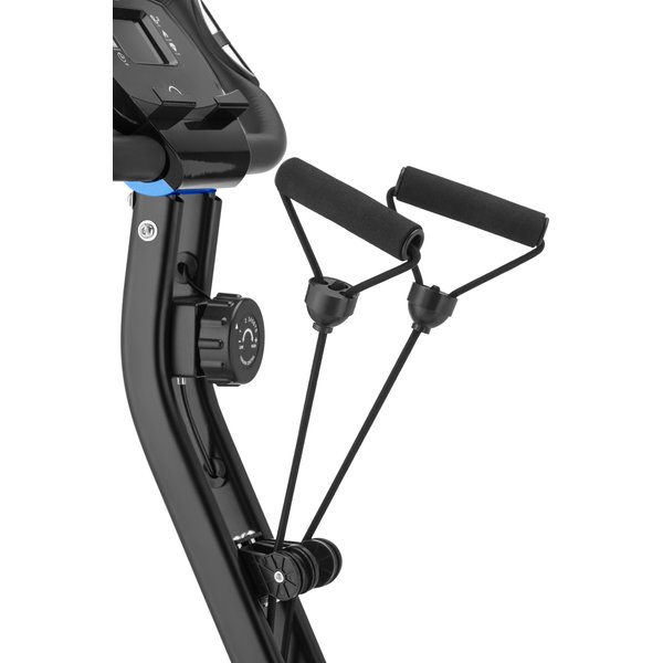 Wewnętrzny system magnetyczny warunkuje cichą i płynną pracę sprzętu. Waga systemu oporu 4kg jest doskonała na potrzeby domowych treningów mających na celu utrzymanie lub poprawę kondycji lub zredukowanie wagi ciała. Rower treningowy posiada składaną konstrukcję, która po złożeniu zajmuje mało miejsca, a jej przechowywanie nie stanowi żadnego wyzwania nawet dla właścicieli niewielkich metrażowo mieszkań. FX600 posiada miejsce na tablet, dzięki któremu możesz pedałować i jednocześnie oglądać ulubiony serial lub słuchać motywującej playlisty. Wzmocniona rama główna sprawia, że na FX600 ćwiczyć mogą osoby ważące do 120kg. Regulowane siodełko łatwo dopasujesz do swojego wzrostu lub preferencji. Składanie i rozkładanie rowerka odbywa się w sposób ręczny.