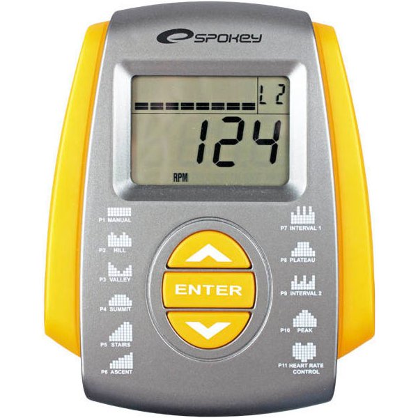 - czas, dystans, prędkość, kalorie, RPM, puls, watt