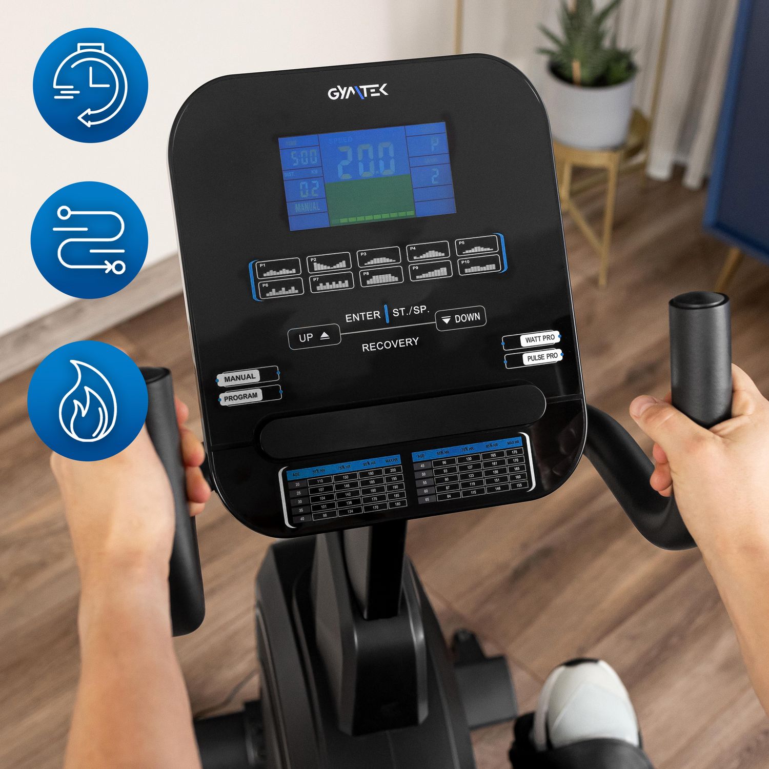 Nowoczesny komputer treningowy z wyświetlaczem LCD dostarcza kluczowych danych o parametrach treningu. Dzięki 21 programom treningowym, w tym opcjom HRC i funkcji Recovery, użytkownik może dostosować intensywność ćwiczeń do swoich potrzeb i celów.