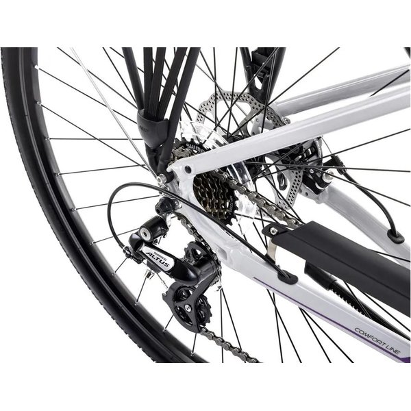 Wyposażony w amortyzowany widelec przedni oraz przerzutki tylne, model ten zapewnia płynne pokonywanie wszelkich nierówności terenu. Wielobiegowy system napędowy Shimano o 21 przerzutkach gwarantuje dostosowanie roweru do każdego rodzaju trasy. Hamulce tarczowe zarówno przednie, jak i tylne zapewniają skuteczne i bezpieczne zatrzymywanie roweru w każdej sytuacji. Oświetlenie przednie i tylne oraz odblaski na kołach zwiększają widoczność rowerzysty na drodze, co przekłada się na bezpieczeństwo podczas jazdy. Dodatkowe elementy, takie jak błotniki przedni i tylny, bagażnik, opony z bieżnikiem, osłona łańcucha, pedały z odblaskami oraz podpórka boczna sprawiają, że Gazela 2 jest kompletnie wyposażonym rowerem trekkingowym.