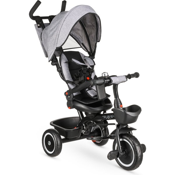 Będzie stanowił bezpieczny i wygodny środek transportu, który będzie mógł zastąpić tradycyjną spacerówkę. Obrotowe siedzisko pozwoli na ustawienie go przodem lub tyłem do kierunku jazdy. Pozwoli to, więc dostosować go do indywidualnych preferencji maluszka. Wygodna rączka do prowadzenia i sterowania rowerkiem pozwoli rodzicom na bezproblemowe operowanie kierunkiem i prędkością jazdy. Dwa pojemniki oraz odpinana saszetka na drobiazgi pozwolą zabrać ze sobą zabawki i inne rzeczy, które przydadzą się podczas spaceru. Bezpieczeństwo zapewnią odpinana barierka i pasy, które zapobiegną one przed wypadnięciem dziecka z rowerka. Komfortowe siedzisko zapewnią wygodę bez względu na jak długi spacer się wybierzemy, a składany daszek uchroni maluszka przed promieniowaniem w słoneczne dni.