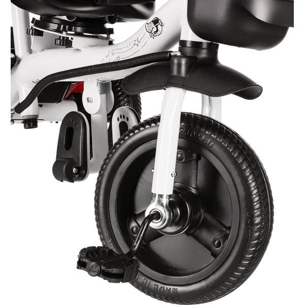 W łatwy sposób zamienimy go w rowerek trójkołowy z pedałami, który pozwoli na dalsze trenowanie swoich zdolności motorycznych oraz pewności ciała. Wystarczy tylko odpiąć barierkę zabezpieczającą oraz prowadnicę i maluch może ruszyć przed siebie! Kierownica posiada antypoślizgowe nakładki co pozwoli na pewny chwyt, a koła z pianki EVA zapewnią komfortową jazdę niezależnie od nawierzchni.