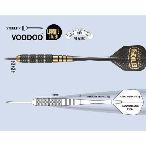 Stylowe rzutki z mosiądzu Harrows Voodoo mają wyjątkowe, czarne radełkowania na barelach. Celem tego jest zapewnienie maksymalnej przyczepności i kontroli. Shafty z anodowanego aluminium w połączeniu z aerodynamicznymi piórkami tworzą doskonały lot. Końcówki Steeltip są ostre i przeznaczone do gry na tarczach sizalowych i papierowych.