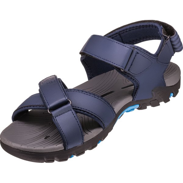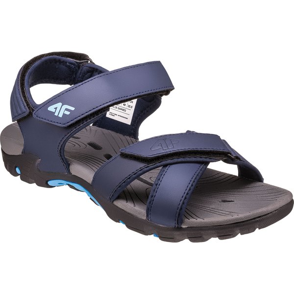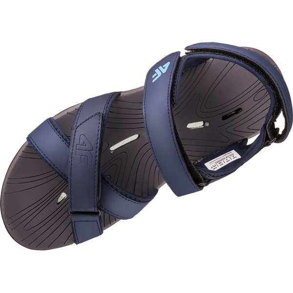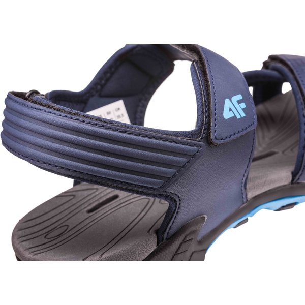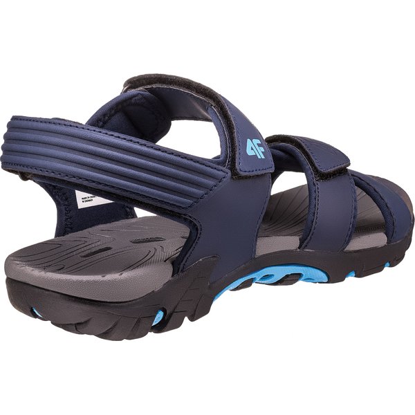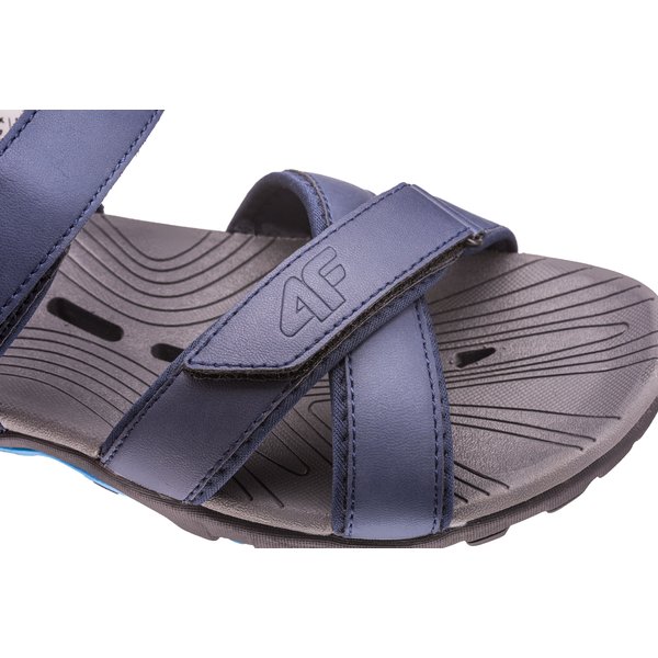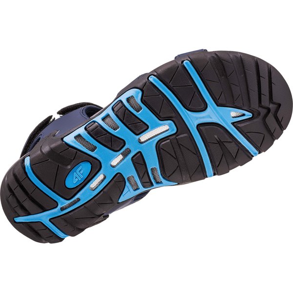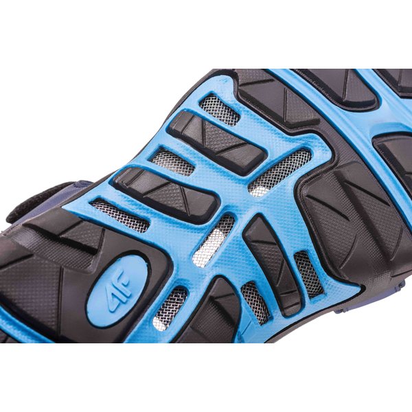 Sandały dla mężczyzn SAM002 z kolekcji H4L18 marki 4F zapewniają komfort noszenia dzięki podwójnemu zapięciu na rzep oraz wewnętrznej wkładce o zróżnicowanej fakturze. Ponadto sandały posiadają od wewnątrz dodatkową warstwę materiału, dzięki czemu ryzyko otarć zostaje zminimalizowane. Specjalne, wentylowane otwory w podeszwie zabezpieczone metalową siatką gwarantują przewiewność podczas letnich dni i chronią stopy przed urazami. Podeszwa z bieżnikiem zapewnia dobrą przyczepność do podłoża.