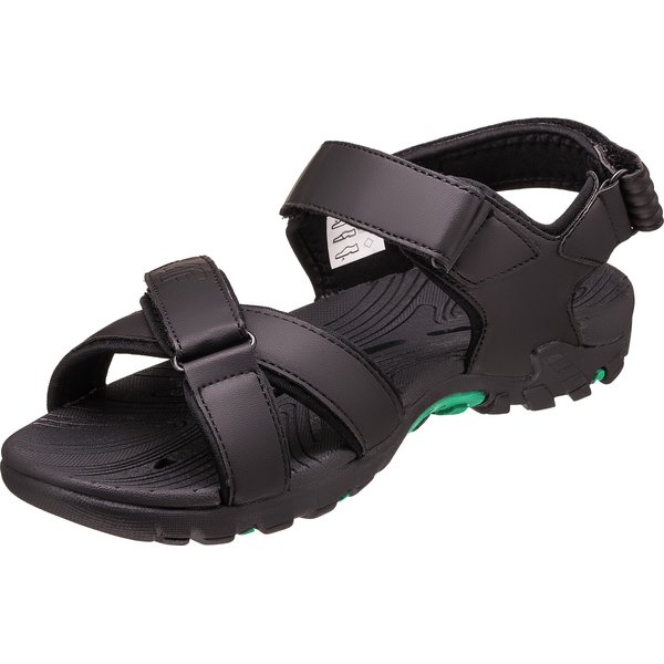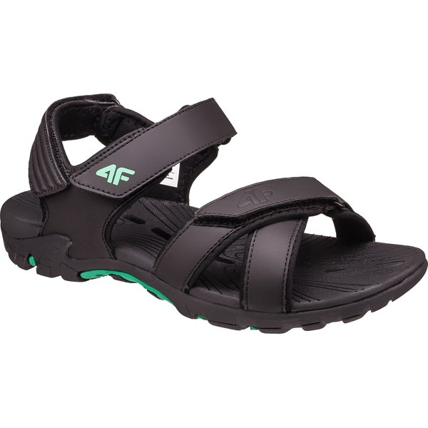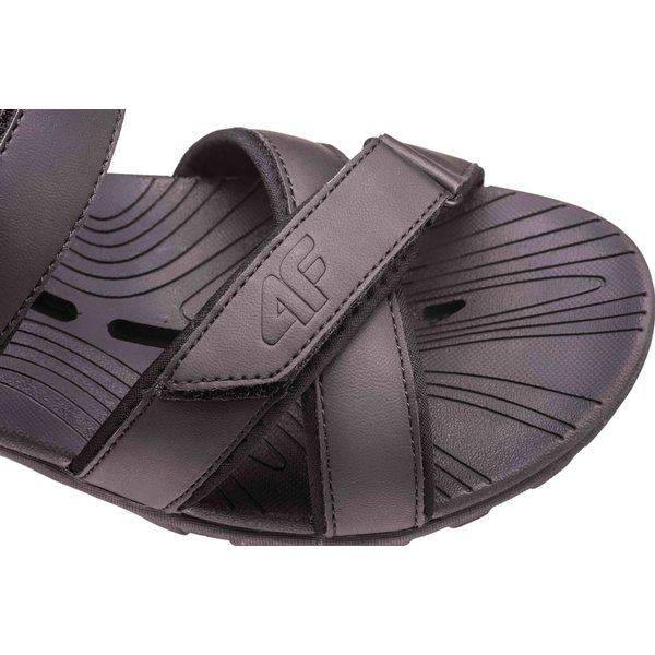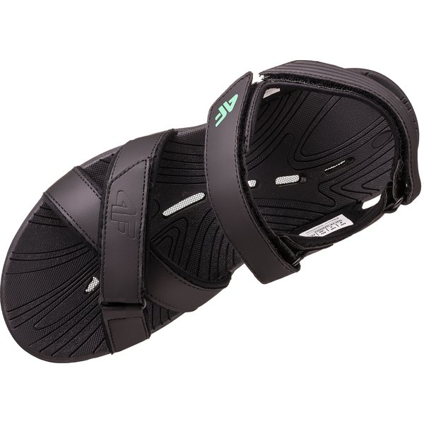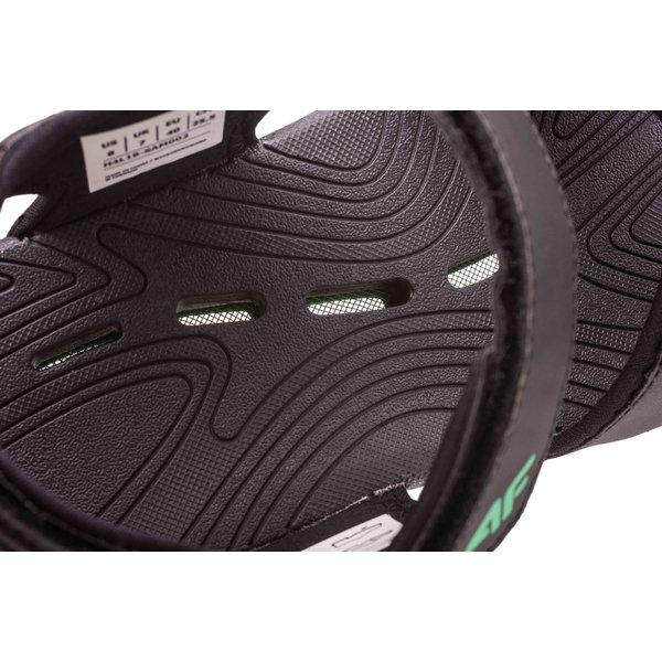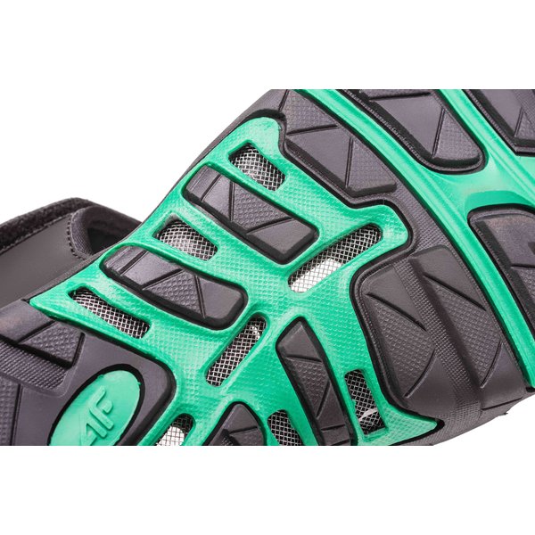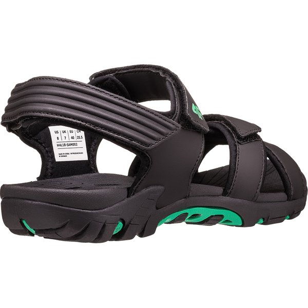 Sandały dla mężczyzn SAM002 z kolekcji H4L18 marki 4F zapewniają komfort noszenia dzięki podwójnemu zapięciu na rzep oraz wewnętrznej wkładce o zróżnicowanej fakturze. Ponadto sandały posiadają od wewnątrz dodatkową warstwę materiału, dzięki czemu ryzyko otarć zostaje zminimalizowane. Specjalne, wentylowane otwory w podeszwie zabezpieczone metalową siatką gwarantują przewiewność podczas letnich dni i chronią stopy przed urazami. Podeszwa z bieżnikiem zapewnia dobrą przyczepność do podłoża.