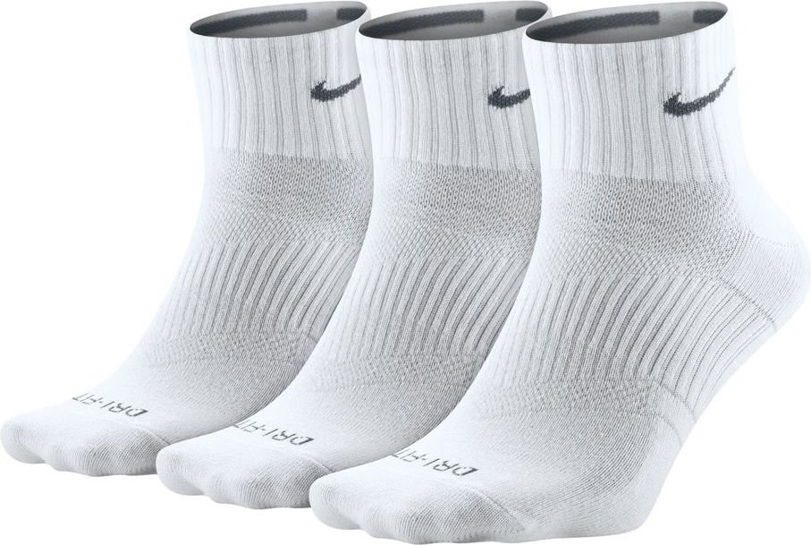 Skarpetki dla aktywnych - Dri Fit Lightweight Quarter marki Nike. Są miękkie, idealnie dopasowane do stopy i dzięki technologii Dri-FIT odprowadzają wilgoć na zewnątrz tkaniny. Komfort to podstawa! W zestawie są aż 3 pary, więc wystarczą na długo.