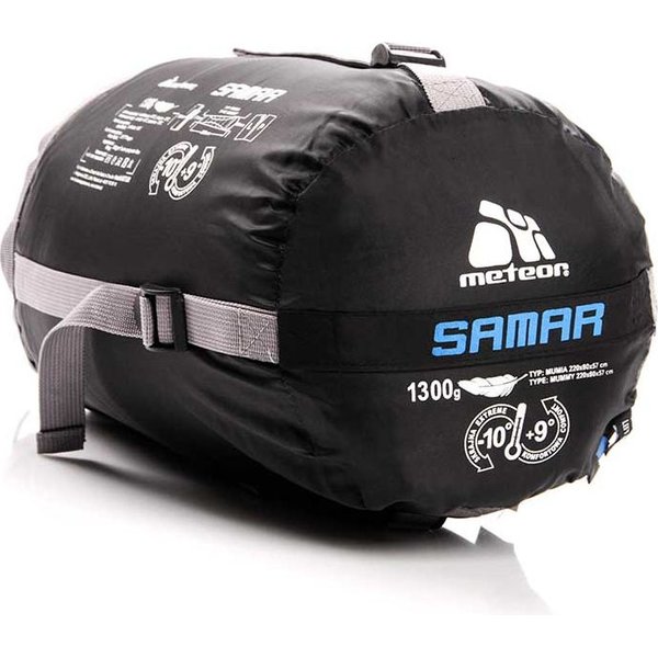Samar posiada odpowiednią konstrukcję, która nie ogranicza swobody ruchów, dzięki czemu każdej nocy zregenerujesz się po dniu pełnym aktywności. Ten model jest dostępny w wersji dla lewo i praworęcznych osób, dlatego też posiada system umożliwiający łączenie śpiworów ze sobą. Duży zakres temperatury sprawia, że śpiwór może być użytkowany od wiosny do jesieni. Śpiwór zapinany jest na 2-kierunkowy zamek, który jest wygodny w obsłudze. Wewnątrz śpiworu znajduje się kieszonka zapinana na rzep, która pomieści Twoje drobiazgi. Każdy chodź raz przekonał się jak irytujące jej zacięcie materiału w zamku czy to kurtki, czy właśnie śpiworu. Przezorny producent Meteor pomyślał i o tym aspekcie i wyposażył śpiwór Samar a taśmę, która zapobiega temu uciążliwemu zjawisku.