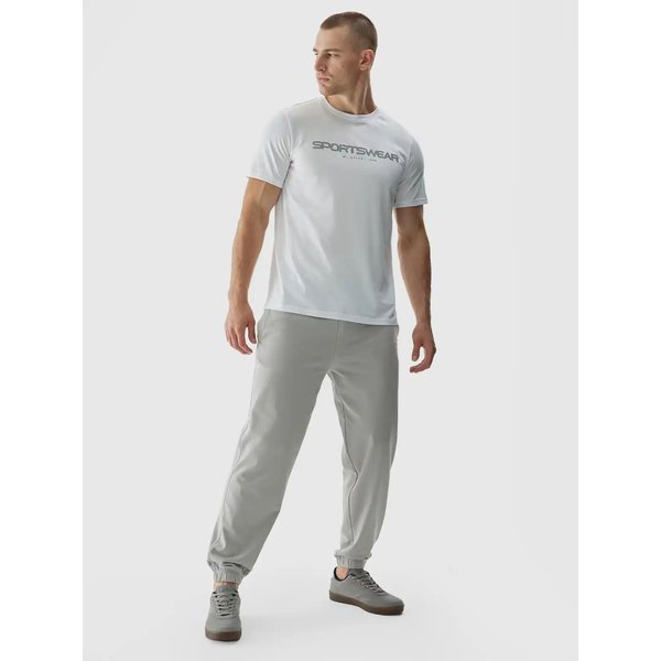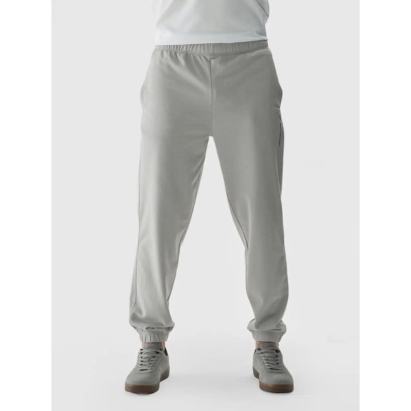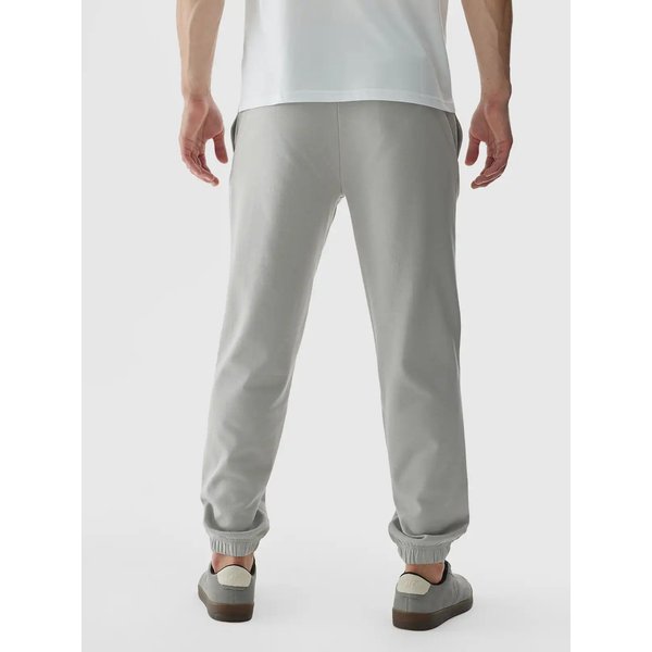 Spodnie męskie marki 4F oferują komfort i wygodę na co dzień dzięki zastosowaniu jednostronnie drapanej dzianiny, która zapewnia miękkość i przyjemność noszenia. Elastyczny pas z regulacją umożliwia idealne dopasowanie do sylwetki, co zwiększa komfort użytkowania. Dwie boczne kieszenie oraz dodatkowa kieszeń tylna zapewniają praktyczne miejsce na drobiazgi. Ściągacze przy nogawkach nie tylko dodają nowoczesnego wyglądu, ale również pomagają w utrzymaniu ciepła. Prosty krój nogawek oraz brak widocznych zamków i guzików zapewniają klasyczny, estetyczny wygląd. Spodnie te są idealne na codzienne wyjścia, jak i aktywny wypoczynek.