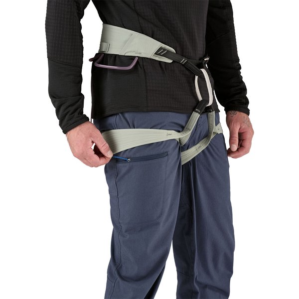 Spodnie posiadają również wiele praktycznych rozwiązań, które podnoszą komfort ich użytkowania. Częściowo elastyczny pas z zamkiem błyskawicznym i szlufkami na pasek gwarantuje wygodne dopasowanie, zmniejszając ucisk pod uprzężą wspinaczkową. Wpuszczane kieszenie z przodu wyposażone są w oddychające siateczkowe wnętrze oraz płaską konstrukcję, co minimalizuje dyskomfort podczas noszenia uprzęży. Dla dodatkowej funkcjonalności, spodnie posiadają dwie tylne kieszenie z wzmocnionym siedziskiem oraz zapinaną na suwak kieszeń na udzie, idealnie dostosowaną do przechowywania drobnych przedmiotów bez ryzyka ich zgubienia podczas wspinaczki. Regulowane mankiety, wyposażone w niskoprofilową linkę amortyzującą i blokadę sznurka, pozwalają na dostosowanie długości nogawki do indywidualnych potrzeb, co jest praktycznym rozwiązaniem w zmieniających się warunkach terenowych.