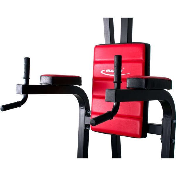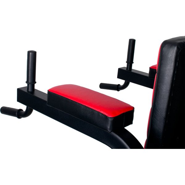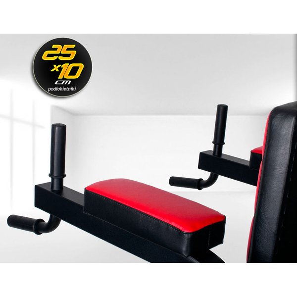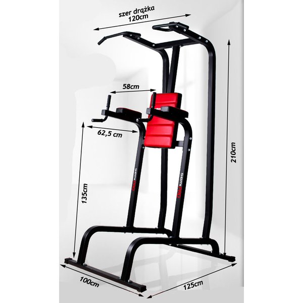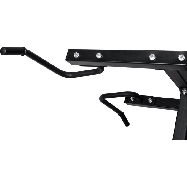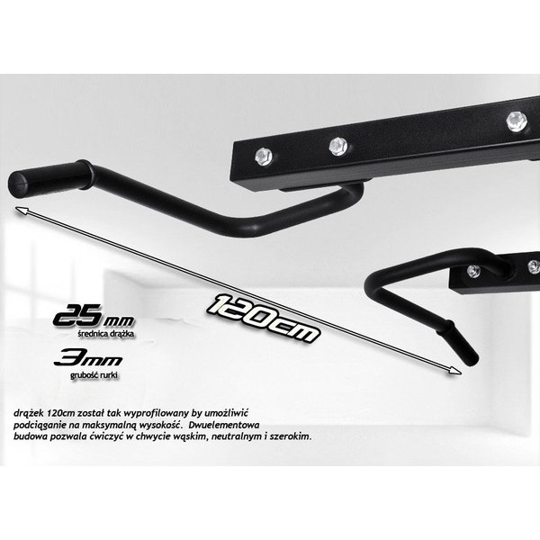 Poręcz charakteryzuje się atrakcyjnym designem, bardzo mocną konstrukcją i nowoczesną tapicerką. Dwuelementowy drążek pozbawiony jest poprzeczki dzięki czemu nie blokuje ruchu w górę i pozwala na maksymalnie wysokie podciągnięcia w chwycie wąskim, neutralnym i szerokim.