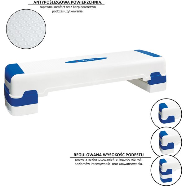 Wykonano go z mocnego materiału, tak więc zapewnia trwałość i bezpieczeństwo ćwiczeń. O to ostatnie dbają też antypoślizgowa powierzchnia i gumowe podkładki - przesuwanie, także to po podłożu, po prostu nie wchodzi w grę! AS005 ma 3-stopniową regulację wysokości, więc zawsze dostosujesz jego wysokość do swoich oczekiwań, umiejętności lub wybranego ćwiczenia. Zmień swoje ciało, popraw kondycję i do tego nie martw się o to, że dysponujesz ograniczoną powierzchnią. Po treningu wsuń step pod łóżko i... już!