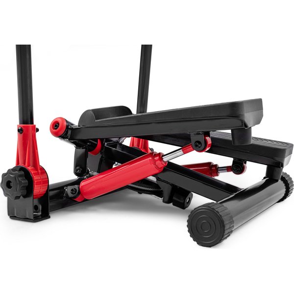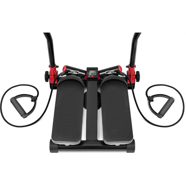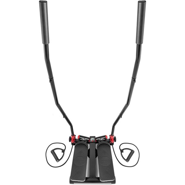 Stepper posiada ramiona, które pozwalają na trening także górnych partii mięśniowych, dzięki nim ćwiczenie na stepperze przypomina marsz z kijami nordic walking. Model wspomaga także ruch boczny, co angażuje do wysiłku jeszcze więcej grup mięśniowych. Praktyczny i prosty w obsłudze licznik zapewnia stałą kontrolę parametrów aktywności. Ekran wyświetla łączny czas treningu w zakresie od 0,00 do 99,59 minut. Funkcja Scan sprawia, że wszystkie parametry wyświetlane są cyklicznie, dzięki czemu nie musisz nic przełączać by ujrzeć interesujący Cię wynik. Wyświetlacz informuje także o łącznej liczbie powtórzeń, liczbie powtórzeń na minutę oraz liczbie spalonych kalorii. W konstrukcji steppera zastosowano siłowniki hydrauliczne gwarantujące cichą i płynną pracę.