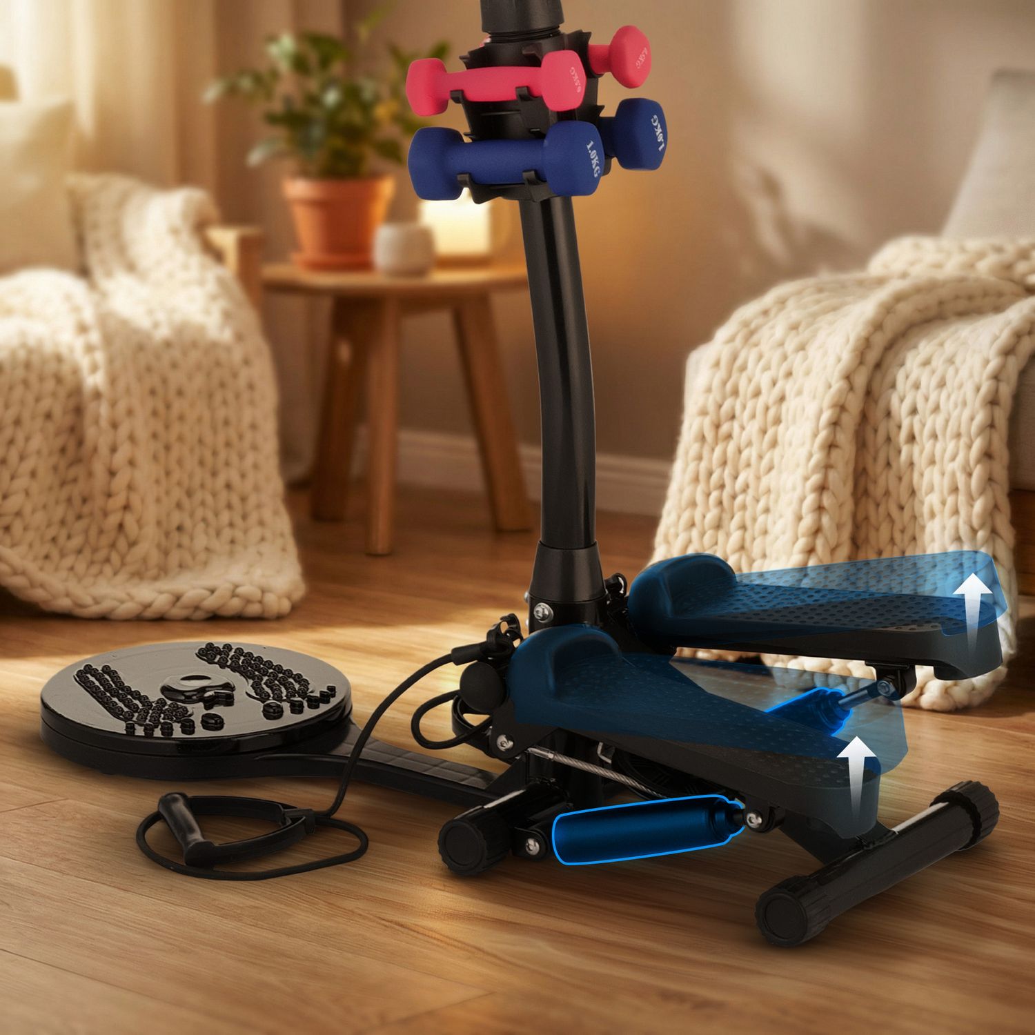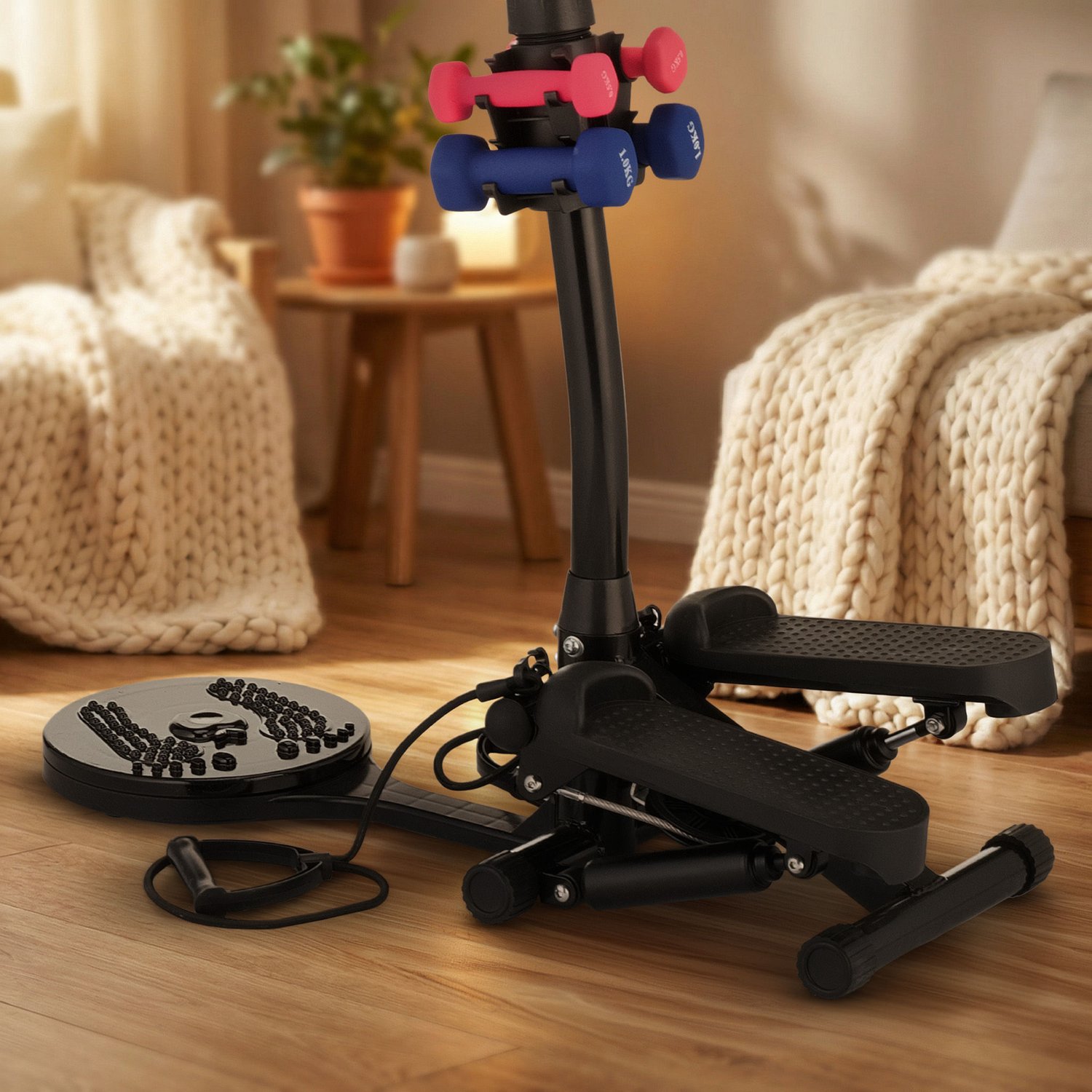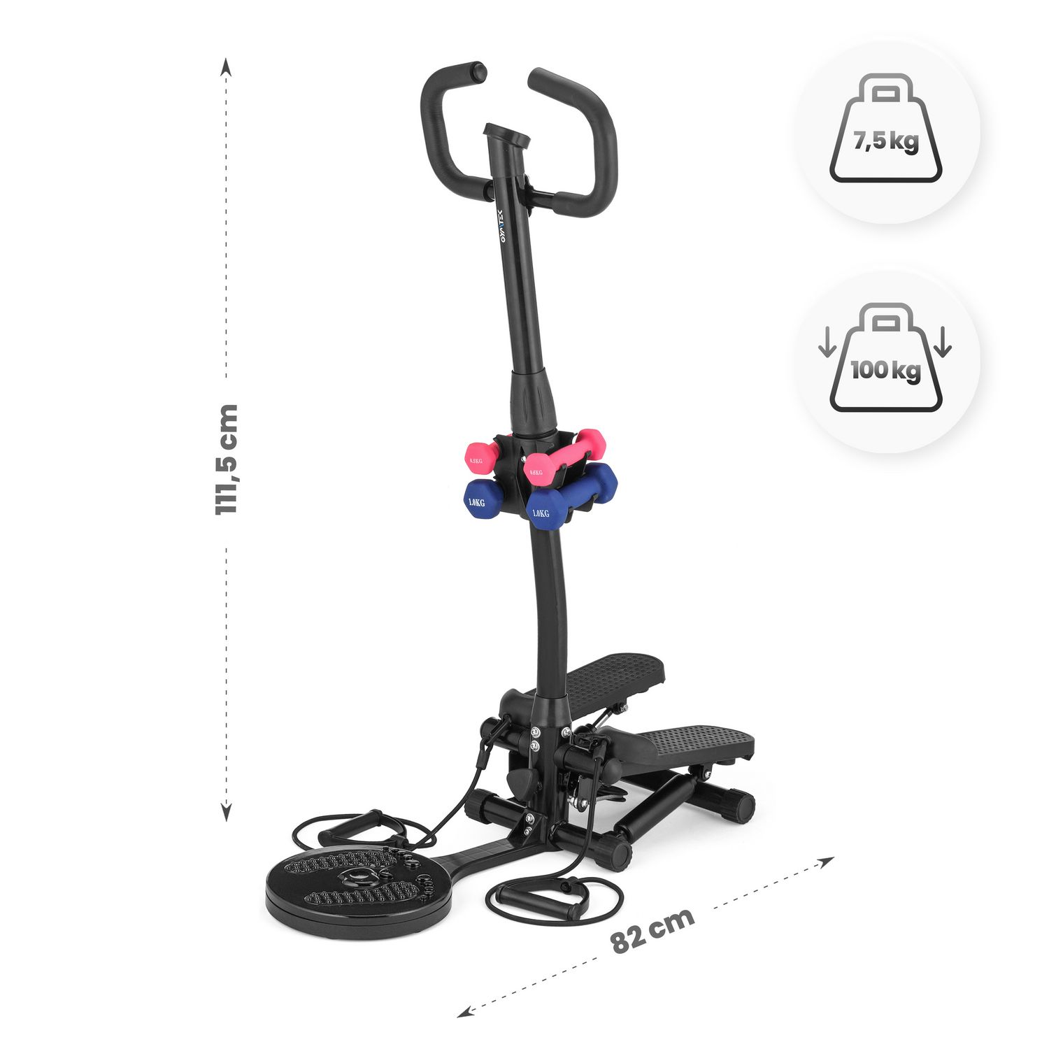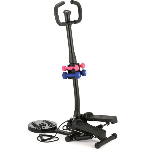 Połączenie steppera, twistera, ekspanderów i hantli w jednym urządzeniu to praktyczne rozwiązanie, które pozwala na urozmaicone ćwiczenia angażujące wszystkie partie ciała – od nóg, przez brzuch, aż po ramiona.
