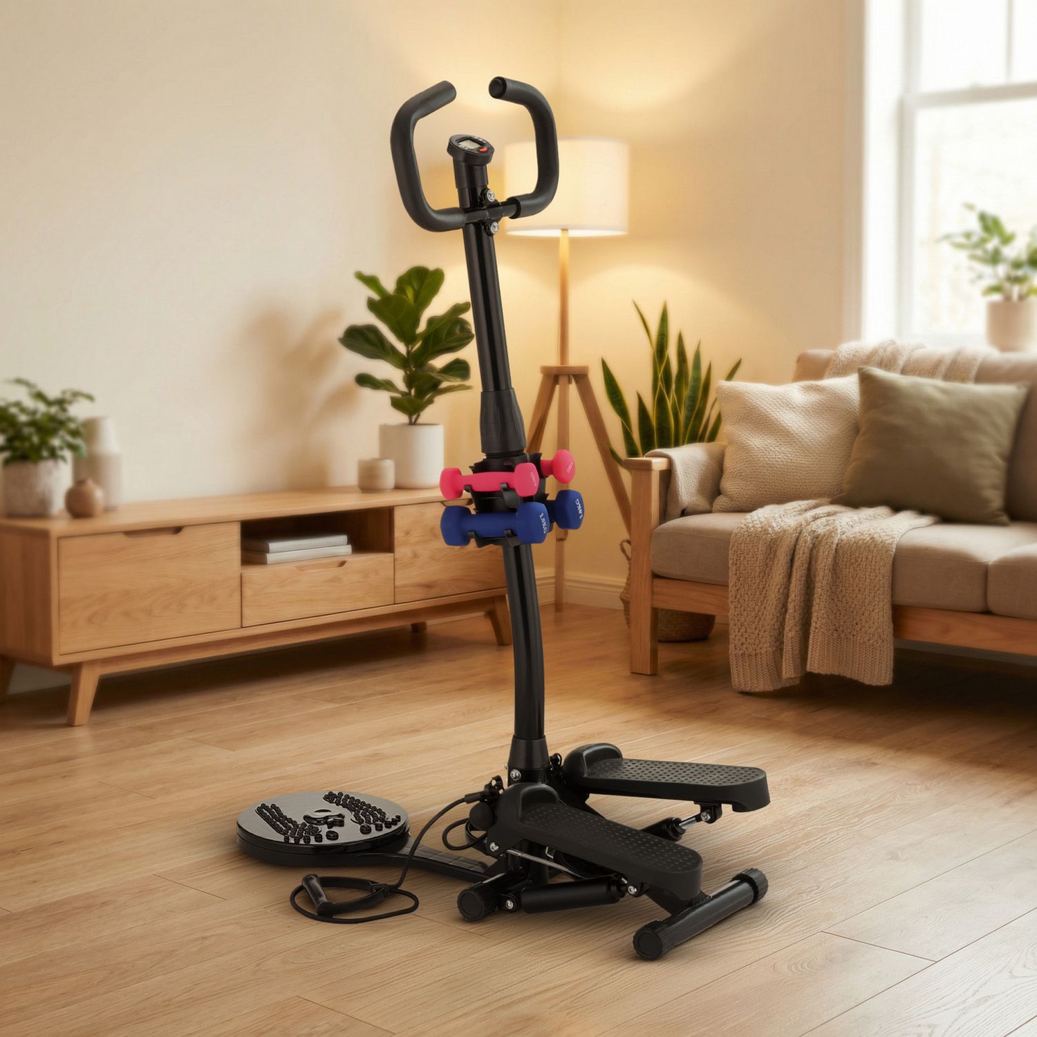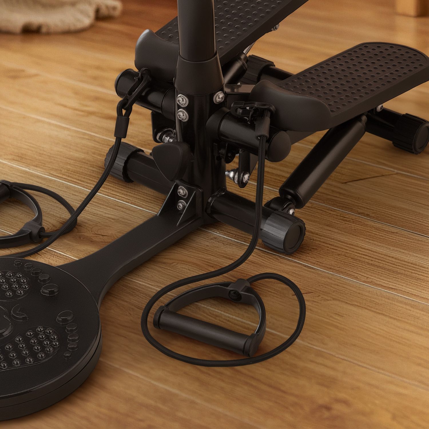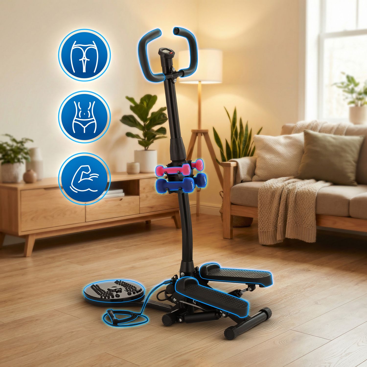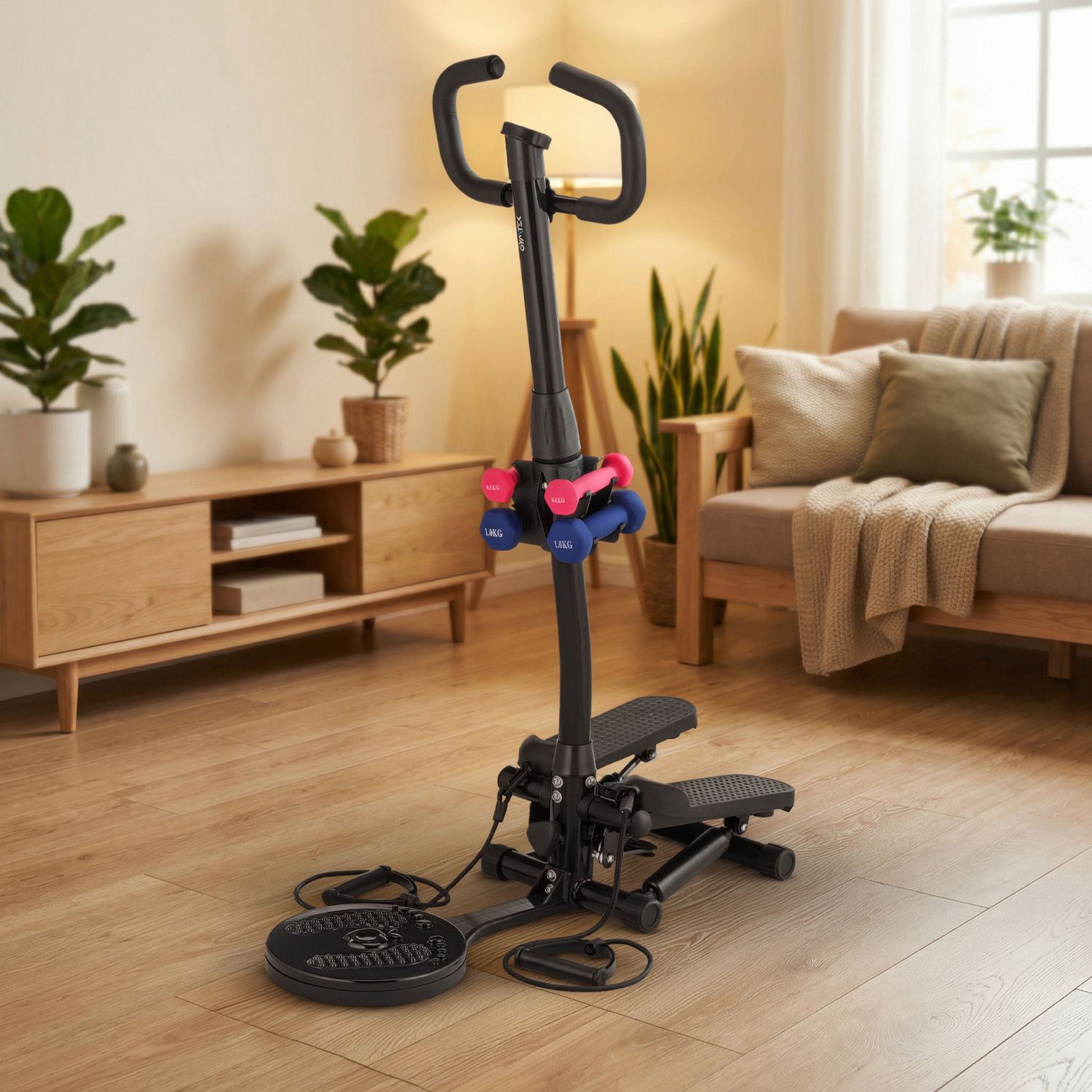 Połączenie steppera, twistera, ekspanderów i hantli w jednym urządzeniu to praktyczne rozwiązanie, które pozwala na urozmaicone ćwiczenia angażujące wszystkie partie ciała – od nóg, przez brzuch, aż po ramiona.