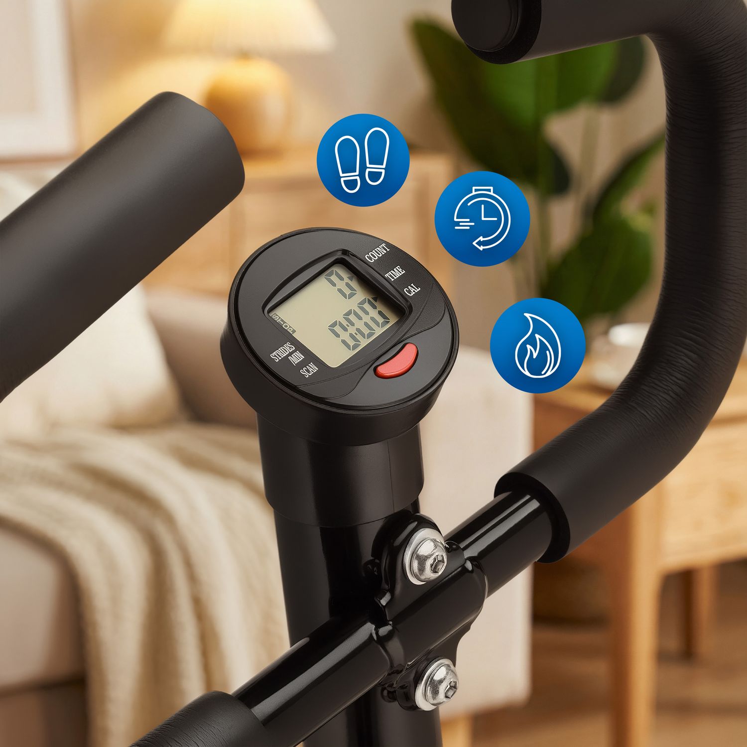 - Intuicyjny wyświetlacz: Wbudowany komputer umożliwia śledzenie czasu, liczby kroków i spalonych kalorii, wspierając regularność i motywację.