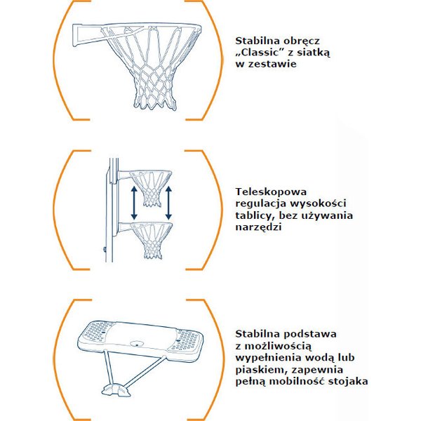 Przenośny i odporny na warunki atmosferyczne stojak do koszykówki, który można łatwo i szybko rozłożyć. Stabilną podstawę można wypełnić wodą lub piaskiem, co zapewnia pełną mobilność stojaka. Teleskopowa regulacja wysokości tablicy, bez używania narzędzi. W zestawie stabilna obręcz "Classic" wraz siatką.