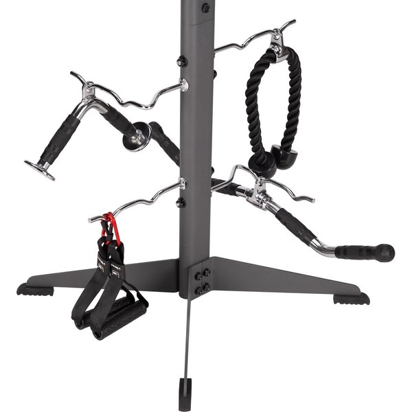 Otwory montażowe na różnych wysokościach umożliwiają dostosowanie haka do indywidualnych potrzeb. Gumowe zakończenia na nogach podstawy zapewniają stabilność i chronią podłogę przed zarysowaniami. W zestawie ze stojakiem STR33 HMS znajdują się również różne akcesoria treningowe, takie jak uchwyty i pasy. Dzięki temu można od razu rozpocząć trening i korzystać z pełnego potencjału tego stojaka.