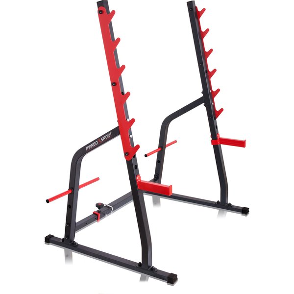 Stojak MS-S107 jest wyposażony w sześcio-stopniową asekurację oraz regulowane w trzech poziomach haki asekuracyjne. Zapewnia to pełne bezpieczeństwo podczas wykonywania różnych ćwiczeń. Haki asekuracyjne można ustawić na trzech różnych wysokościach: 60, 65 oraz 104 cm, dzięki czemu możliwe jest wygodne i bezpieczne ćwiczenie barków czy przysiadów ze sztangą. Stojak MS-S107 posiada również cztery pręty na obciążenia o długości 22 cm i średnicy 25 mm. Dzięki nim można łatwo przechowywać dodatkowe ciężary w zasięgu ręki.