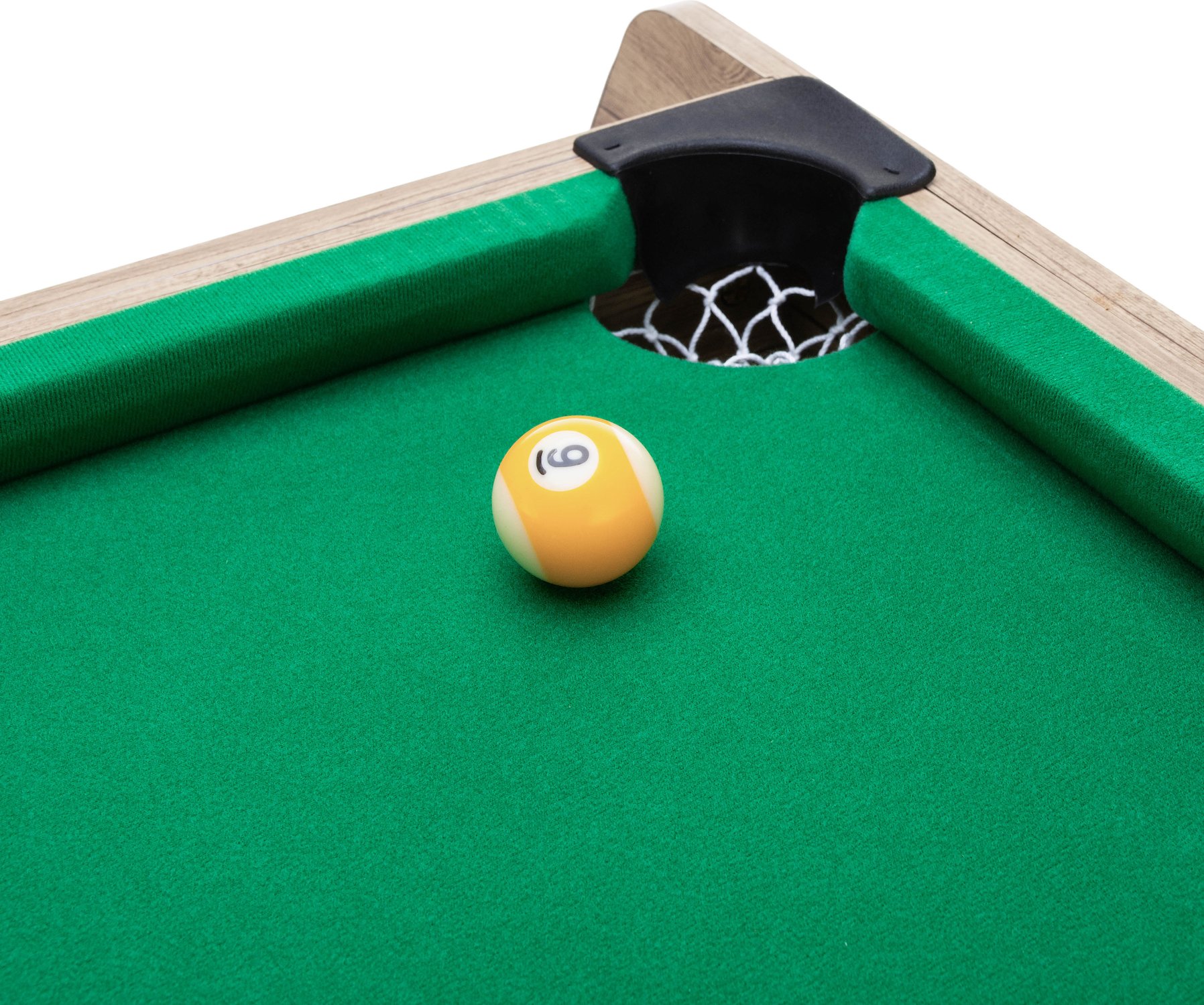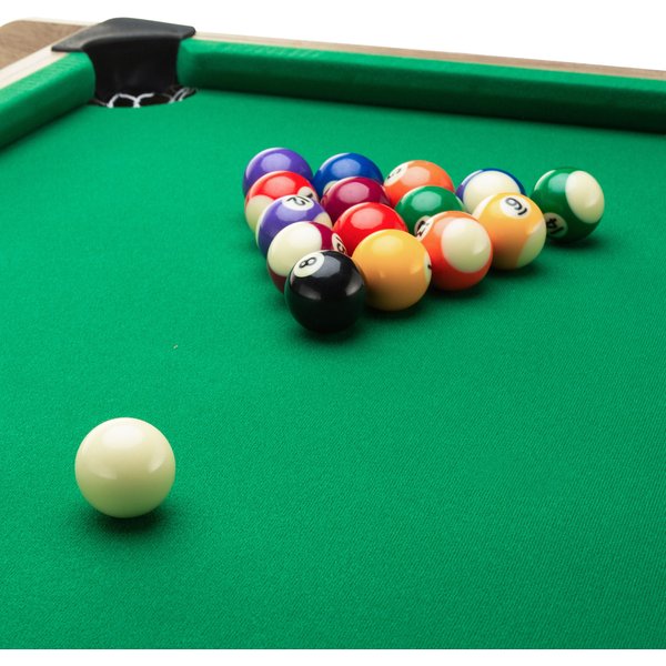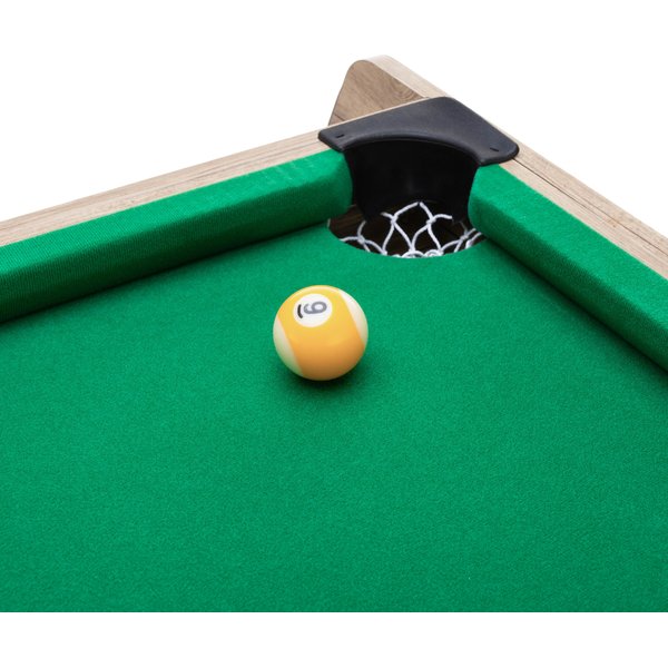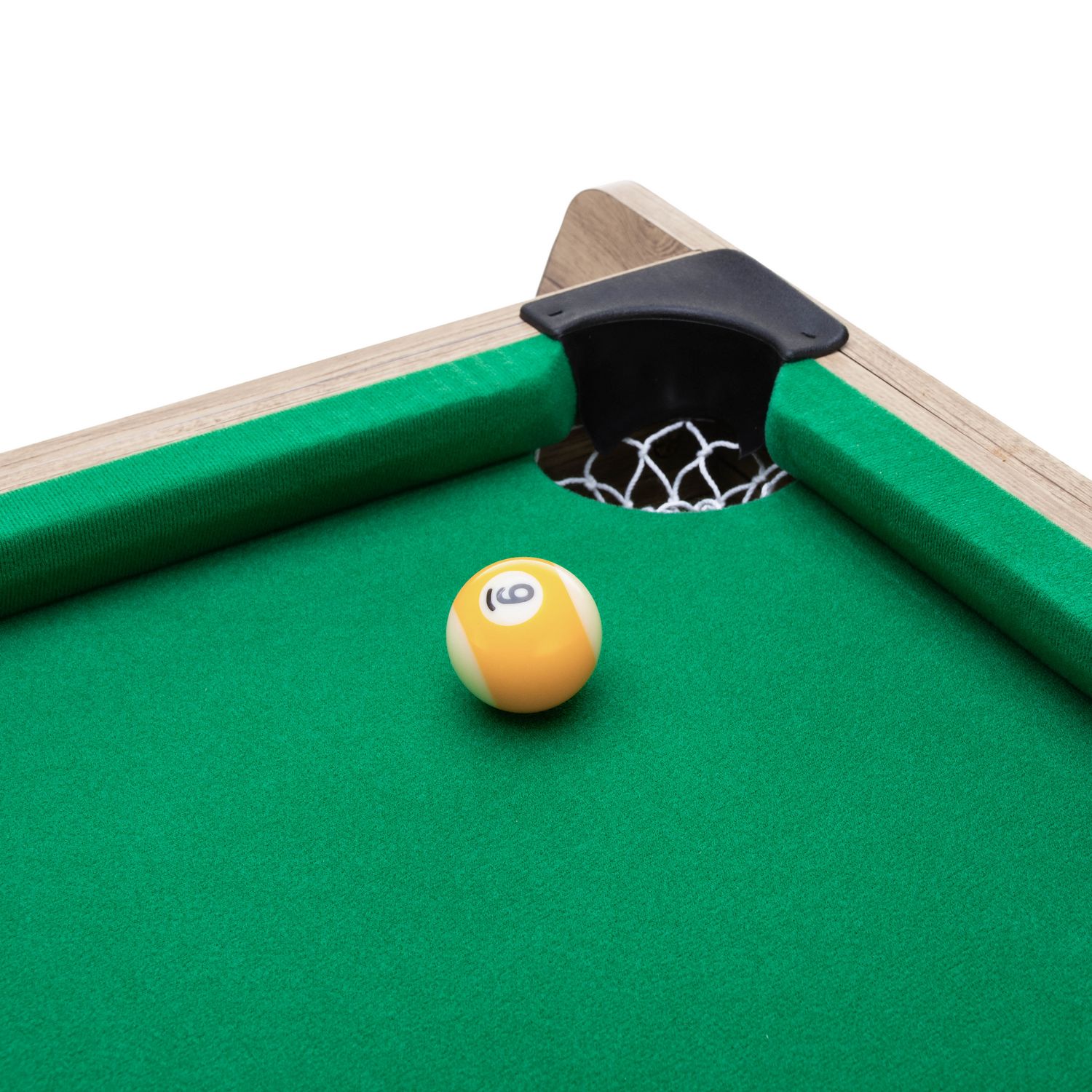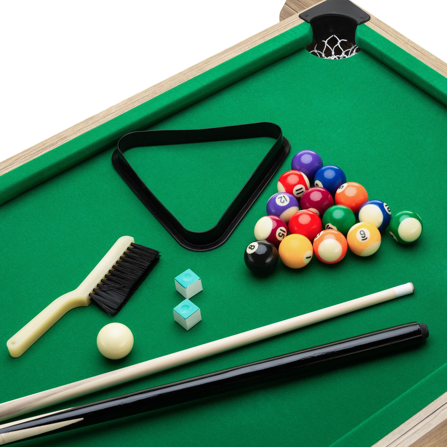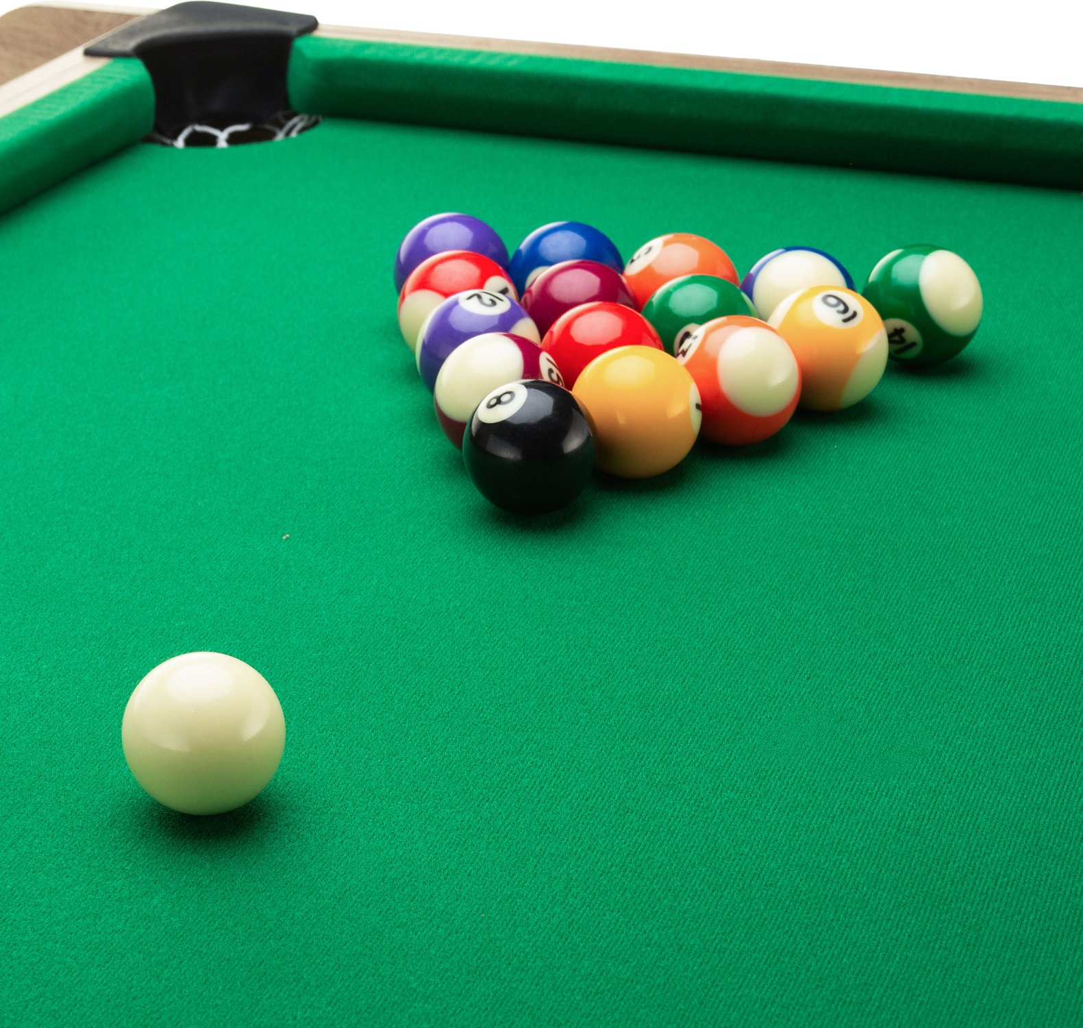 - Wszystko pod ręką: Komplet zawiera 16 bili, trójkąt, 2 kije, 2 kredy i szczotkę do czyszczenia stołu bilardowego, co pozwala cieszyć się pełnoprawną grą bez żadnych kompromisów.