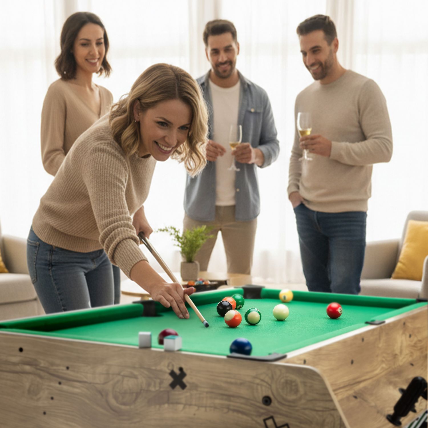 Wszystko, czego potrzebujesz do rozpoczęcia rozgrywki, znajduje się w zestawie – bez konieczności dokupowania dodatkowych elementów. Akcesoria zostały dobrane tak, aby zapewnić pełną funkcjonalność każdej z trzech gier: bilarda, piłkarzyków i cymbergaja, a także wygodę użytkowania i trwałość w codziennym użytkowaniu.