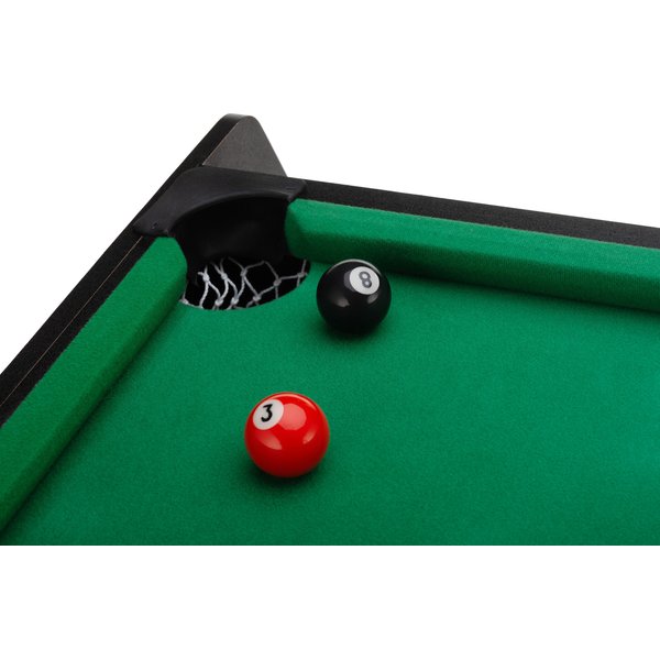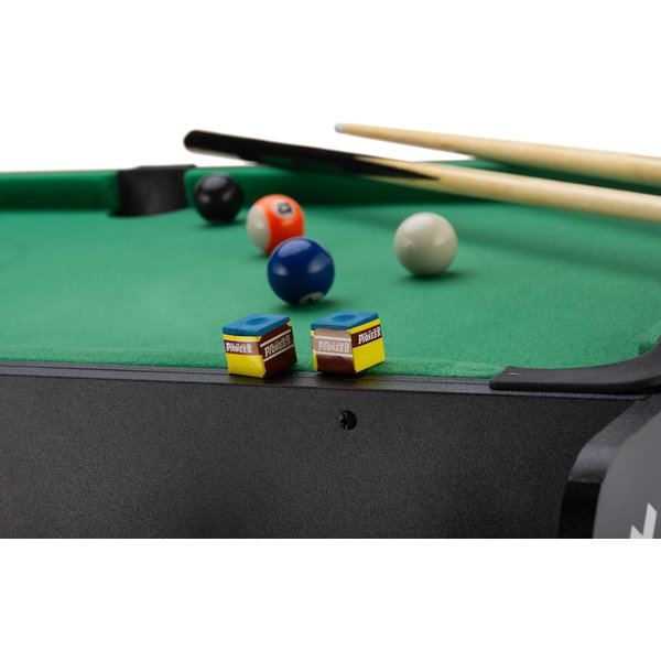 Stół ten został wykonany z wysokiej jakości materiału MDF, co zapewnia jego trwałość i solidność. Dzięki temu możesz cieszyć się grą przez wiele lat bez obaw o uszkodzenia. Wymiary stołu są doskonale dobrane, aby zapewnić komfort gry zarówno dzieciom, jak i dorosłym. Niezbyt duża długość i szerokość stołu sprawiają, że zmieści się on w większości pomieszczeń, a odpowiednia wysokość zapewnia wygodne korzystanie z każdej z trzech funkcji stołu. Zestaw zawiera wszystko, czego potrzeba do rozpoczęcia gry: bili, trójkąt do ustawiania kul, kredy, kije bilardowe, piłeczki do hokeja, uchwyty do gry w hokeja, figurki piłkarzyków, piłki do piłkarzyków, gumowe rączki oraz manualne liczniki do wyników. Dodatkowo, w zestawie znajduje się szczotka do czyszczenia stołu bilardowego oraz wentylator z kratką, który sprawia, że gra w cymbergaj jest płynna i dynamiczna.