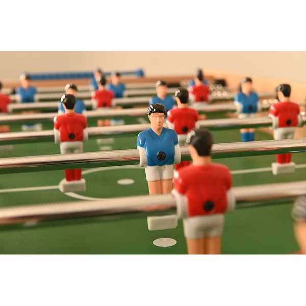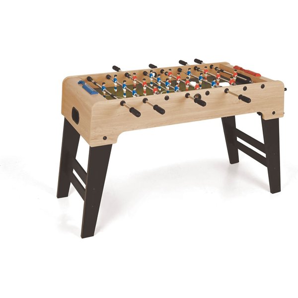 Oprócz tego, stabilne nogi wykonane z wysokiej jakości płyty MDF z możliwością poziomowania gwarantują pewność i stabilność podczas gry, co jest kluczowe, aby czerpać z rozgrywki jak najwięcej przyjemności. Stół wyróżnia się solidną konstrukcją. Obudowa wykonana z MDF pokrytego melaminą zapewnia trwałość i odporność na uszkodzenia, a dodatkowo nadaje estetyczny wygląd w drewnopodobnym kolorze klonu, który będzie pasować do każdego wnętrza. Efekt trawy na tafli boiska dodaje realizmu i sprawia, że gra staje się bardziej angażująca. Zastosowane teleskopowe grille o średnicy 13 mm, pokryte warstwą chromu, są nie tylko wytrzymałe, ale także bezpieczne, co jest szczególnie ważne podczas dynamicznych rozgrywek. Dzięki temu gracze mogą skupić się na rywalizacji bez obaw o bezpieczeństwo. Dodatkowo, rotacyjny bramkarz oraz specjalna konfiguracja zawodników (1-3-4-3) ułatwia zdobywanie bramek, co czyni grę bardziej ekscytującą i satysfakcjonującą.