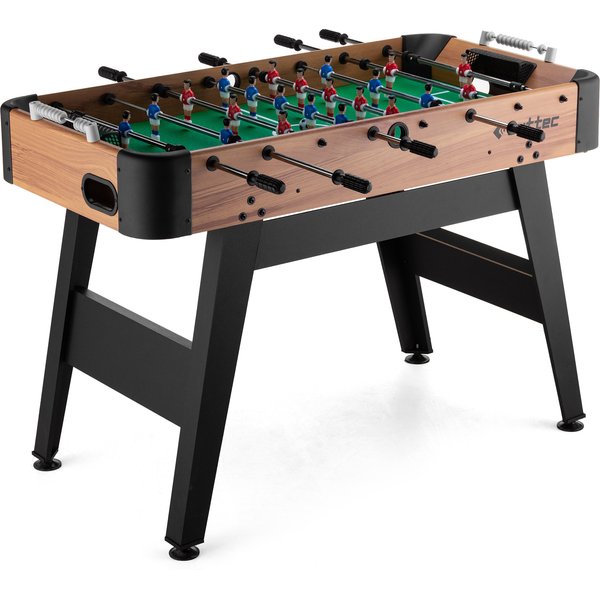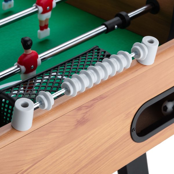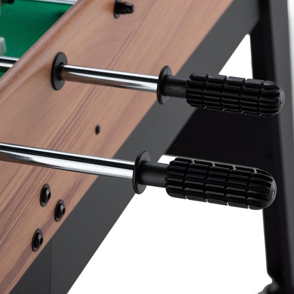 Stół został zaprojektowany z myślą o intensywnej grze – solidny stelaż oraz wytrzymałe materiały zapewniają trwałość i stabilność nawet podczas dynamicznych rozgrywek. Dzięki podwyższonym narożnikom na polu gry piłka nie zatrzymuje się w martwych punktach, co gwarantuje komfortową zabawę.