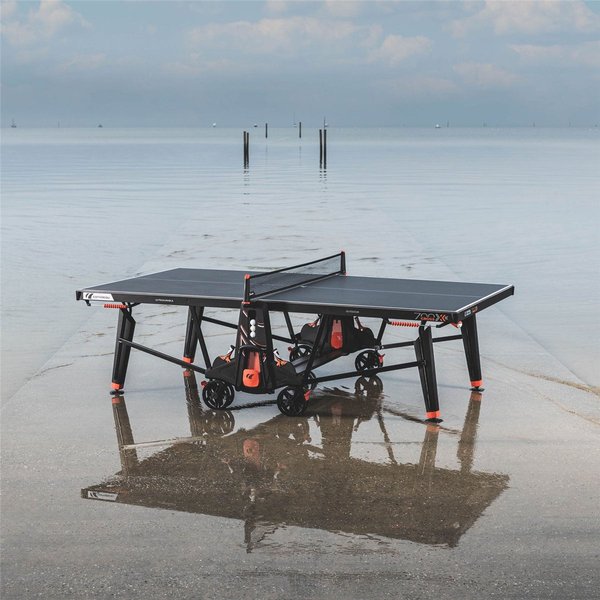 Jego elegancka powierzchnia wprowadza nutę luksusu do ogrodu czy tarasu, a unikatowy projekt jest esencją innowacji i funkcjonalności. Jednym z głównych atutów stołu 700X jest jego powierzchnia do gry wykonana z 8 mm laminatu żywicznego, pokryta specjalną powłoką antyrefleksyjną Mattop. Dzięki niej odbicia piłki są nie tylko szybkie i precyzyjne, ale także powierzchnia jest odporna na zarysowania, uderzenia i promieniowanie UV. Taka konstrukcja zapewnia długowieczność oraz najwyższy komfort gry, niezależnie od warunków atmosferycznych. Stabilność stołu to kolejny z jego wyróżników. Gruba rama z alucynku w połączeniu z blatem nadaje mu solidność, a regulowane nogi pozwalają na precyzyjne dostosowanie wysokości do nierówności podłoża, co jest nieocenione podczas gry na trawie czy kostce brukowej. Koła o dużej średnicy i 32 mm grubości umożliwiają łatwe przemieszczanie stołu, a cztery hamulce gwarantują jego stabilność nawet na nierównym terenie.