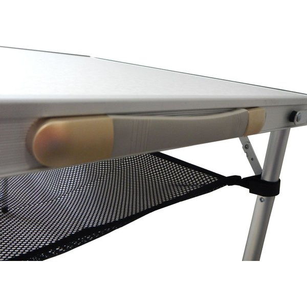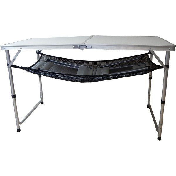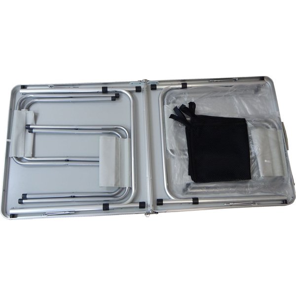 W zestawie znajdziesz stolik, cztery krzesła oraz półkę z siatki. Stół jest składany, a przenoszenie go odbywa się poprzez kształt walizki. Wykonano go z aluminium, co sprawia, że całość jest lekka i wytrzymała. Półka z siatki pozwoli Ci mieć przy sobie wszystkie niezbędne przedmioty. Stół łatwo utrzymać w czystości, dlatego dobrze sprawdzi się w ogrodzie, czy też na rybach.