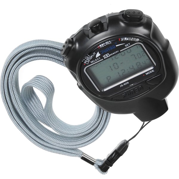 Stoper posiada możliwość zapamiętywania 100 międzyczasów. Idealny do szkół i na treningi.