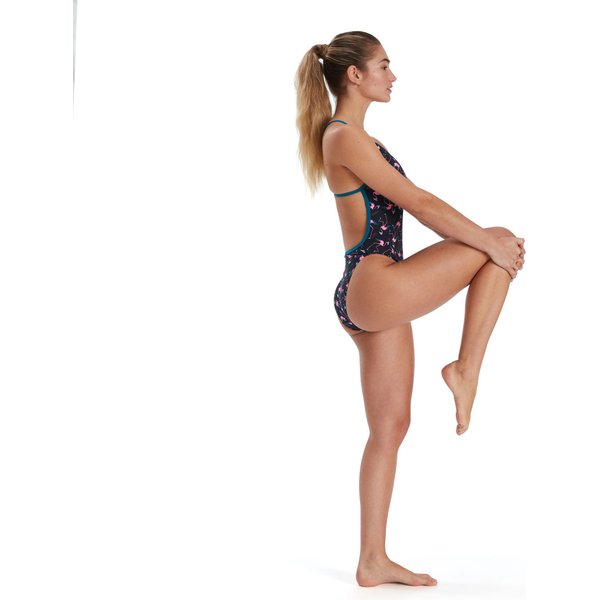 Ten kostium kąpielowy to idealny wybór dla aktywnych kobiet, które cenią sobie wygodę i wysoką jakość. Wykonany z 53% poliestru z recyklingu oraz 47% PBT dzięki czemu jest przyjazny dla środowiska. Tkanina Endurance®+ zapewnia wyższą odporność na chlor, co oznacza, że kostium zachowa swoją jakość nawet przy częstym użytkowaniu w basenie. Quick Dry to kolejna cecha, która sprawia, że materiał szybko schnie. Ten model posiada mocno wycięty tył, co nadaje mu stylowego wyglądu. Dodatkowo podszyty jest tkaniną, co zapewnia jeszcze większy komfort użytkowania.